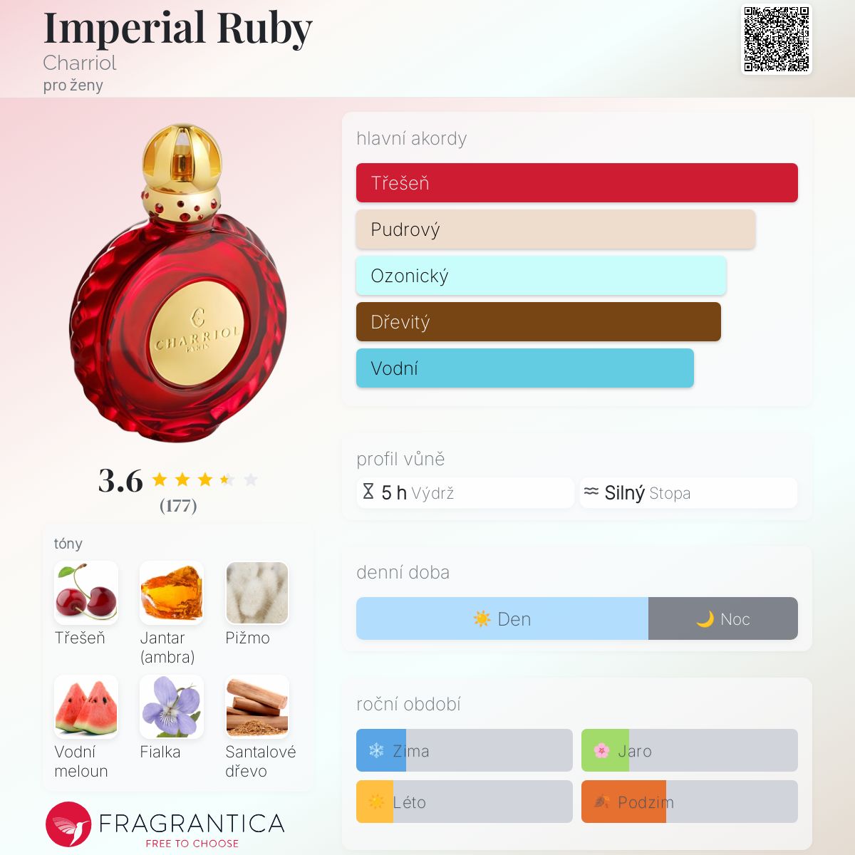 Imperial Ruby podle Charriol je Floral Fruity vůně pro ženy. Imperial Ruby byl/a uveden/a v roce 2011. "Nosem" za touto vůní je Michel Almairac. Vrchní tóny jsou Třešeň, Vodní meloun a Bergamot; střední tóny jsouFialka, Santalové dřevo, Růže a Fialkový list ; základní tóny jsou Jantar (ambra), Pižmo a Virginský cedr.