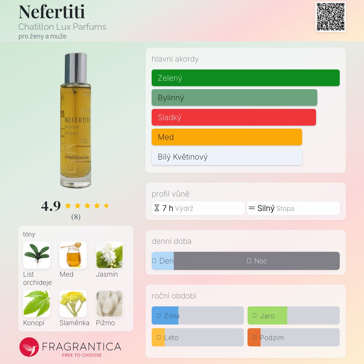 Nefertiti podle Chatillon Lux Parfums je vůně pro ženy a muže. Nefertiti byl/a uveden/a v roce 2019. "Nosem" za touto vůní je Shawn Maher. Vrchní tóny jsou List orchideje a Konopí; střední tóny jsouMed, Jasmín, Slaměnka a Kadidlo ; základní tóny jsou Pižmo, Vetiver a Agarové dřevo (oud).