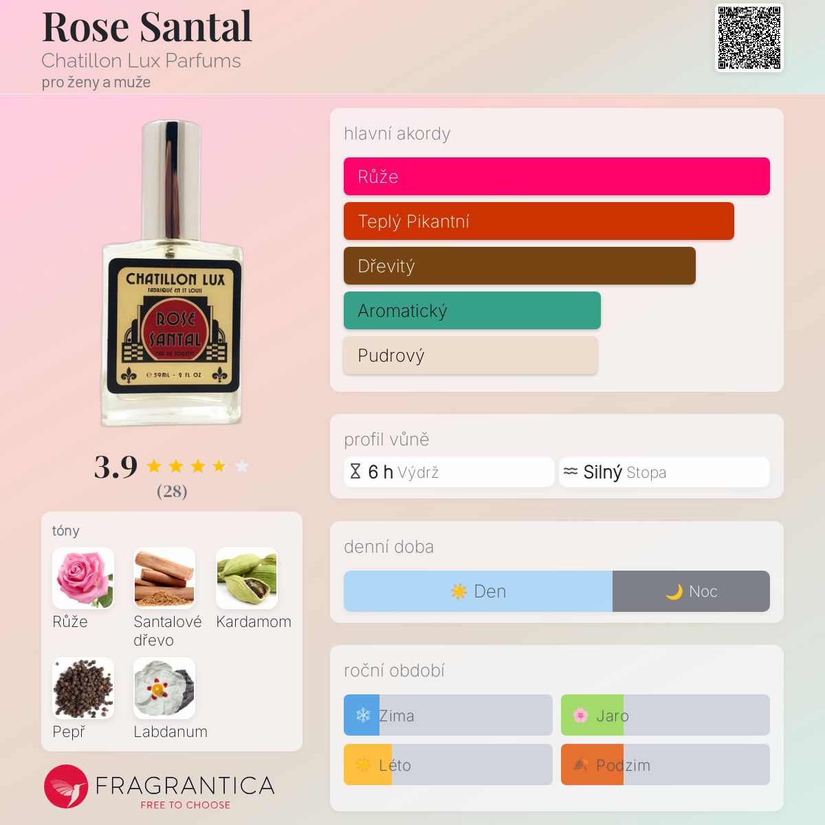 Rose Santal podle Chatillon Lux Parfums je vůně pro ženy a muže. Rose Santal byl/a uveden/a v roce 2017. "Nosem" za touto vůní je Shawn Maher.
