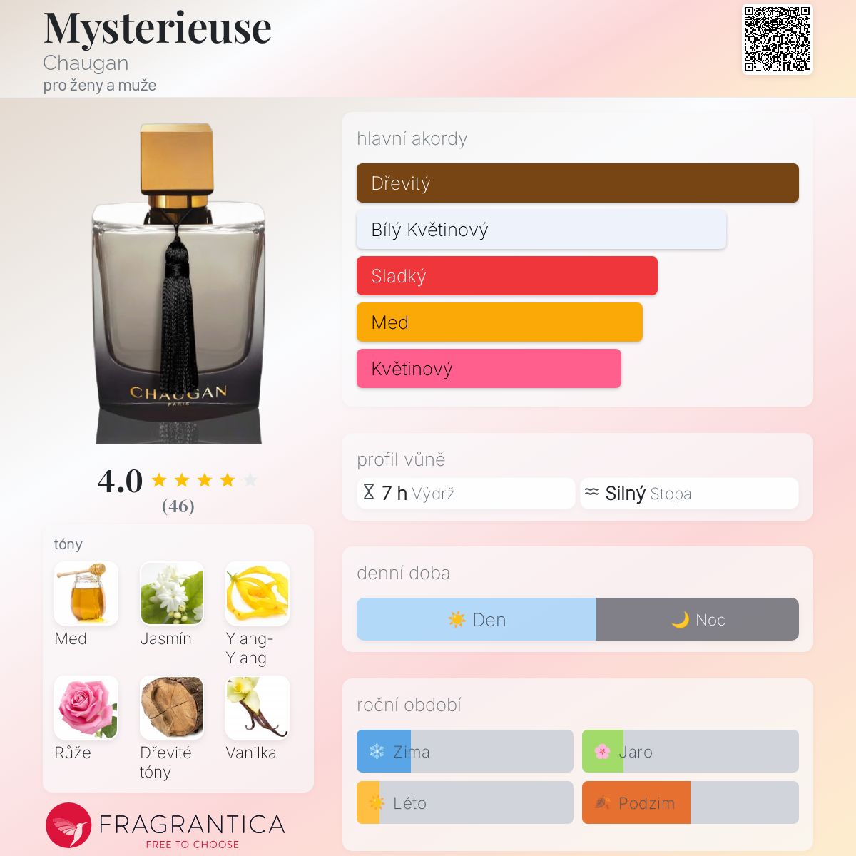 Mysterieuse podle Chaugan je Floral Woody Musk vůně pro ženy a muže. Mysterieuse byl/a uveden/a v roce 2013. Vrchní tóny jsou Med, Ylang-Ylang, Konvalinka a Růžový grapefruit; střední tóny jsouJasmín, Růže, Pačuli, Cedr a Guajakové dřevo ; základní tóny jsou Dřevité tóny, Vanilka, Santalové dřevo, Kůže a Pomerančový květ.