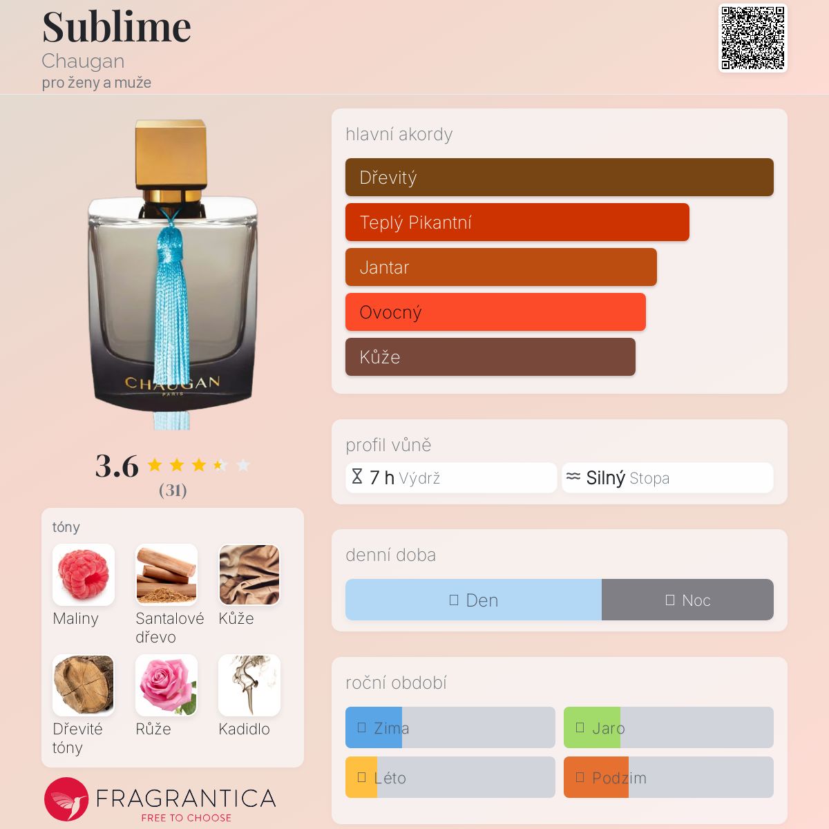 Sublime podle Chaugan je Orientální Vanilla vůně pro ženy a muže. Sublime byl/a uveden/a v roce 2015. Vrchní tóny jsou Růže, Černý pepř a Zázvor; střední tóny jsouMaliny, Růže a Kadidlo ; základní tóny jsou Santalové dřevo, Kůže, Dřevité tóny a Jantar (ambra).