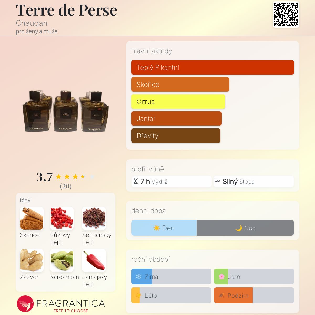 Terre de Perse podle Chaugan je Woody Spicy vůně pro ženy a muže. Terre de Perse byl/a uveden/a v roce 2017. Vrchní tóny jsou Růžový pepř, Sečuánský pepř a Citrón; střední tóny jsouSkořice, Zázvor, Kardamom, Jamajský pepř, Karafiát a Magnólie ; základní tóny jsou Santalové dřevo, Jantar (ambra), Cedr, Benzoin, Pižmo a Fazole tonka.