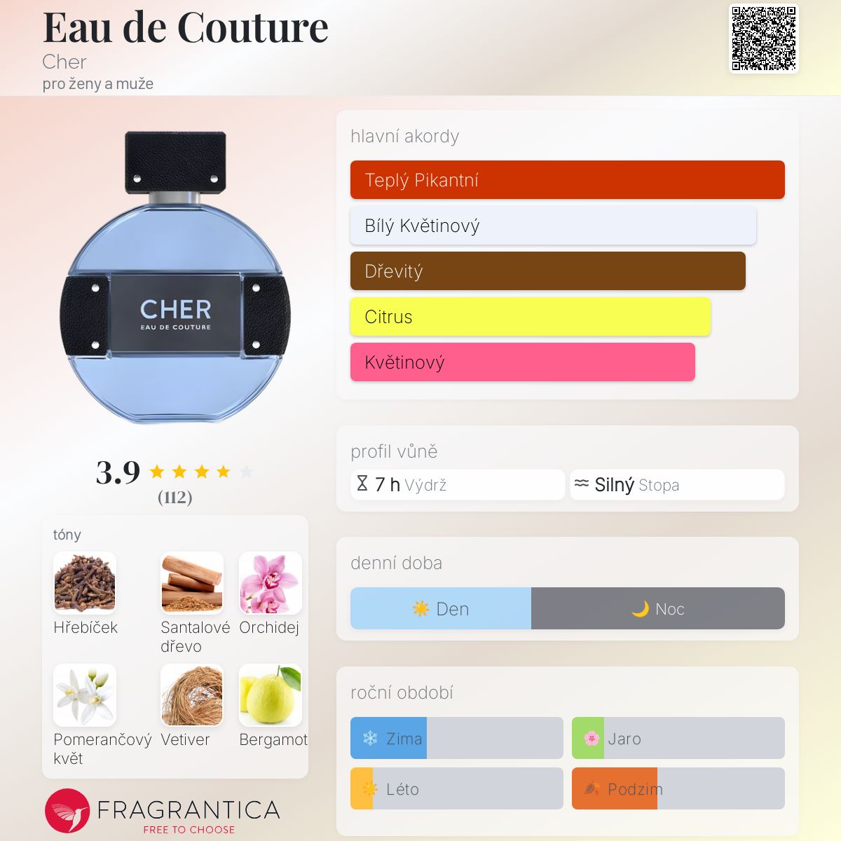 Eau de Couture podle Cher je Orientální Spicy vůně pro ženy a muže. Eau de Couture byl/a uveden/a v roce 2019. "Nosem" za touto vůní je Clement Gavarry. Vrchní tóny jsou Hřebíček, Bergamot a Neroli; střední tóny jsouPomerančový květ, Jasmín a Růže ; základní tóny jsou Santalové dřevo, Vanilková orchidej a Vetiver.