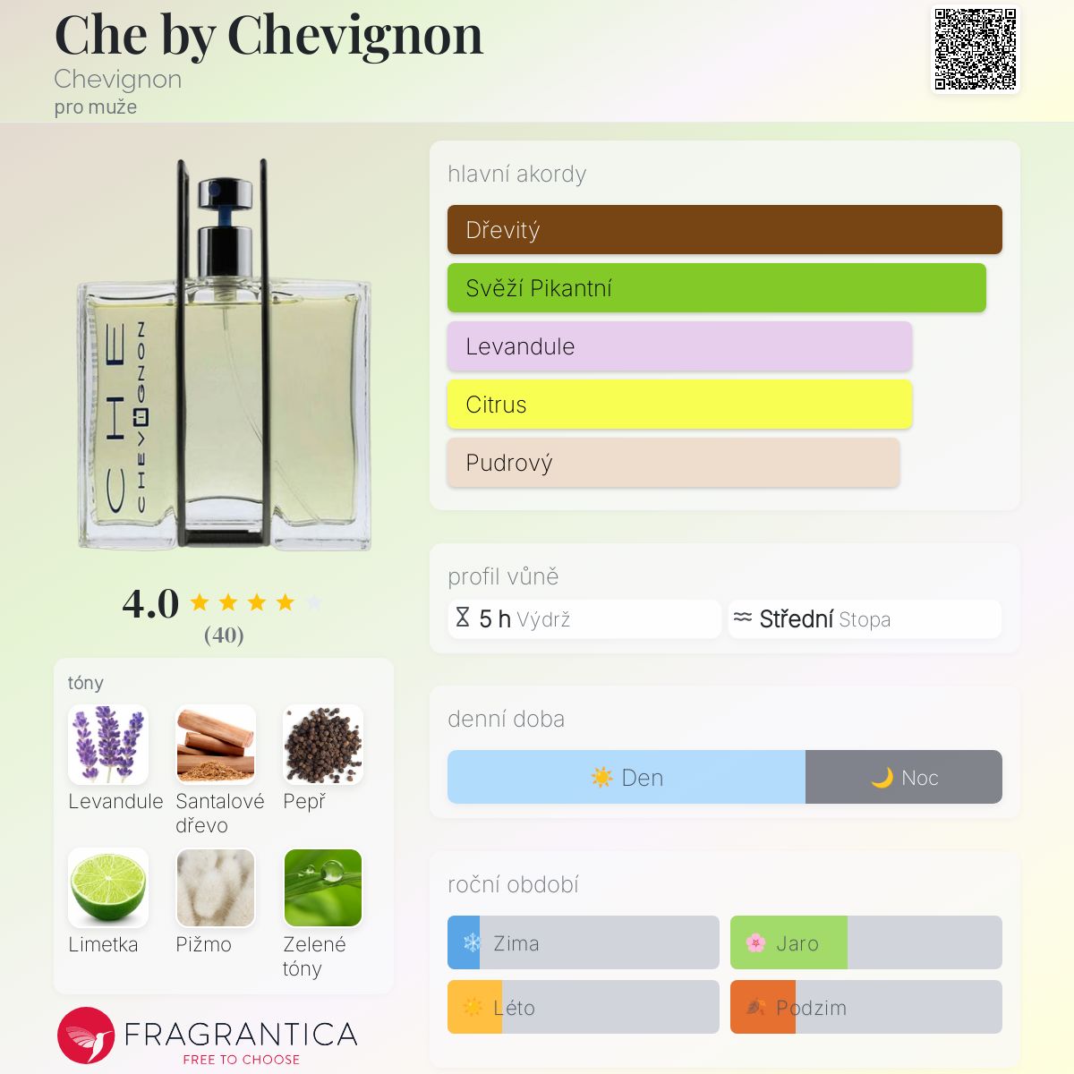 Che by Chevignon podle Chevignon je Woody Aromatic vůně pro muže. Vrchní tóny jsou Limetka, Zelené listí a Grapefruit; střední tóny jsouLevandule, Pepř, Jasmín, Mandle a Cedr ; základní tóny jsou Santalové dřevo, Pižmo, Jantar (ambra) a Dubový mech.