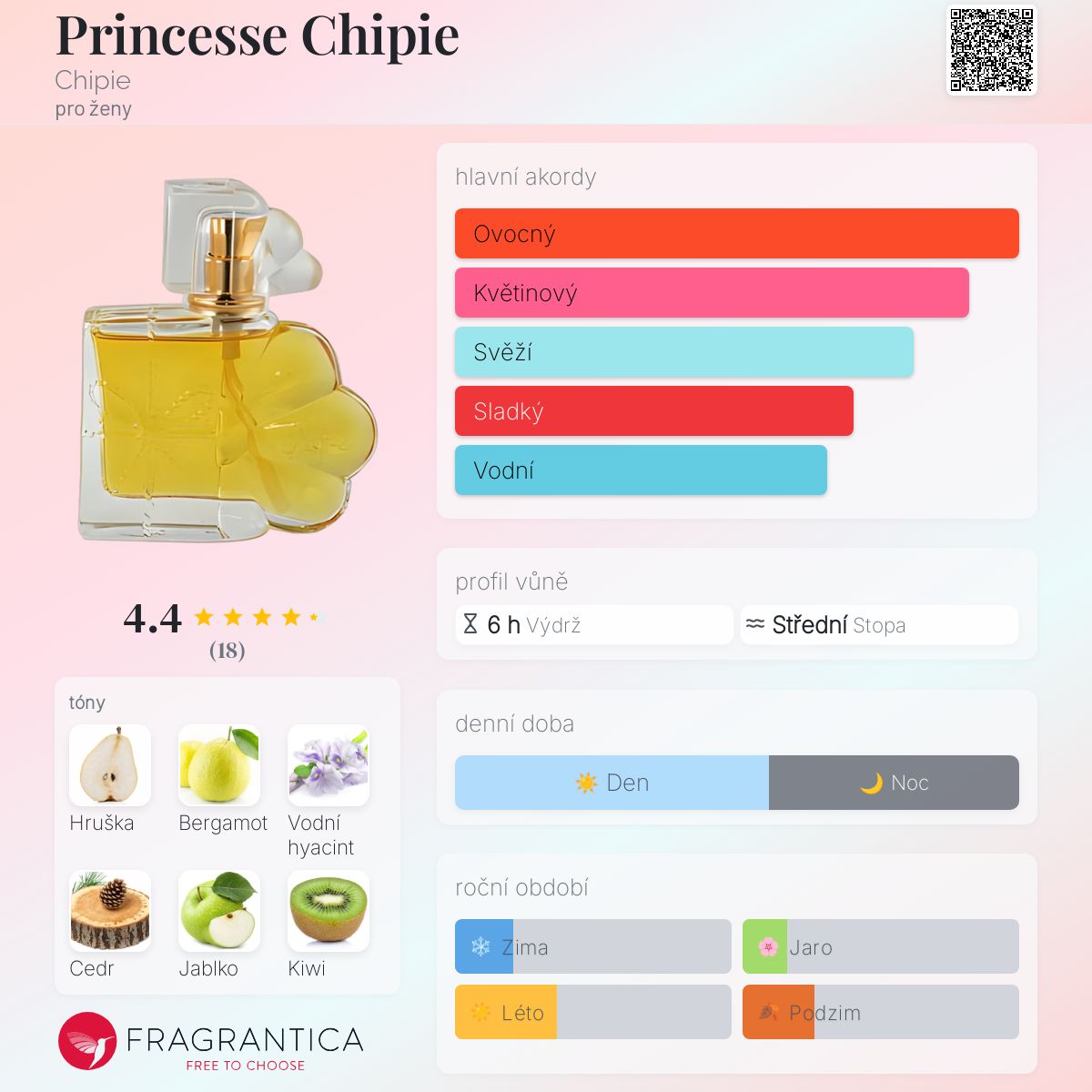 Princesse Chipie podle Chipie je Floral Fruity Gourmand vůně pro ženy. Princesse Chipie byl/a uveden/a v roce 1997. Vrchní tóny jsou Hruška, Bergamot, Granny Smith jablko, Kiwi, Frézie a Broskev; střední tóny jsouVodní hyacint, Růže, Pivoňka a Konvalinka ; základní tóny jsou Virginský cedr, Jantar (ambra), Karamel, Pižmo a Benzoin.