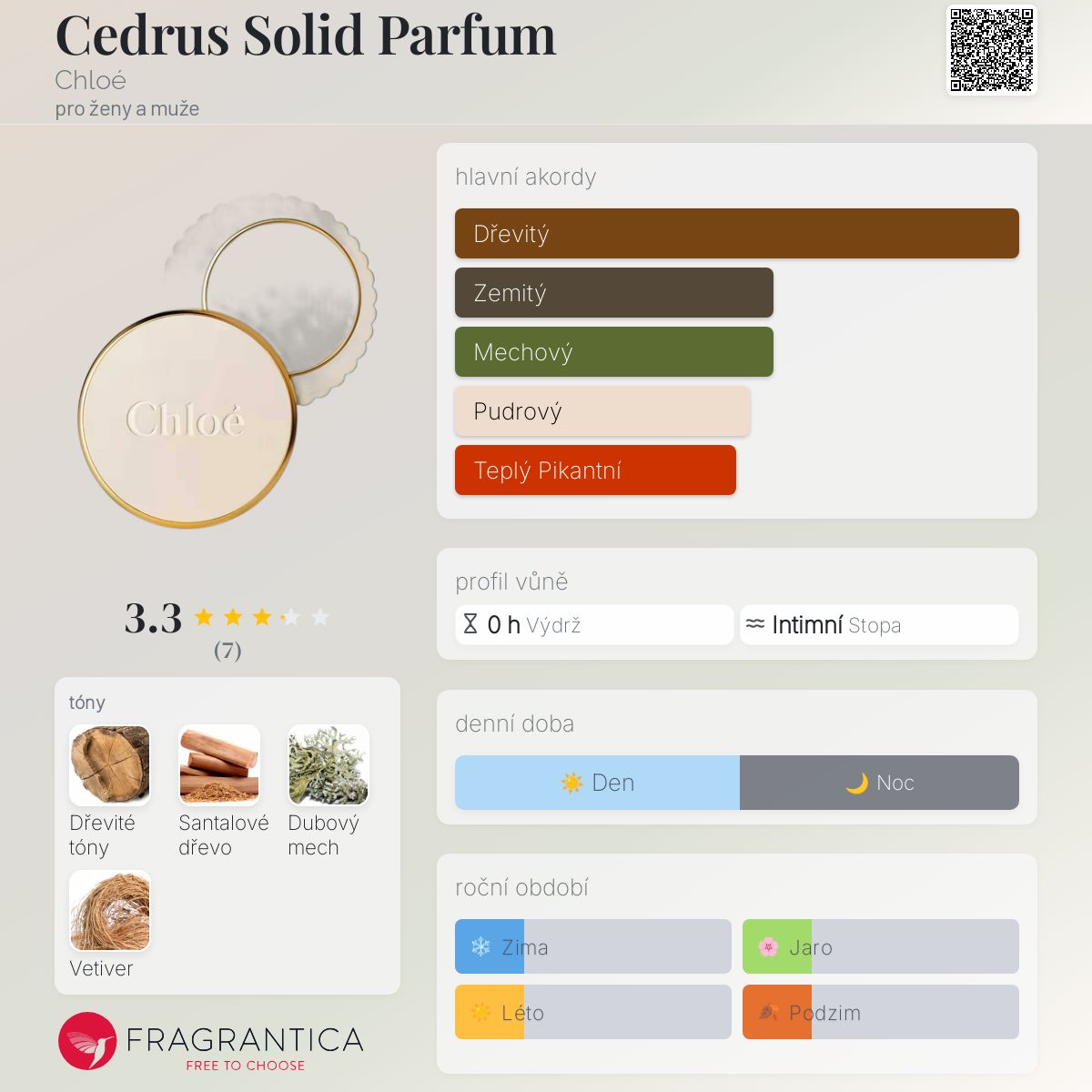 Cedrus Solid Parfum podle Chloé je Woody vůně pro ženy a muže. Toto je nová vůně. Cedrus Solid Parfum byl/a uveden/a v roce 2025. "Nosem" za touto vůní je Quentin Bisch.