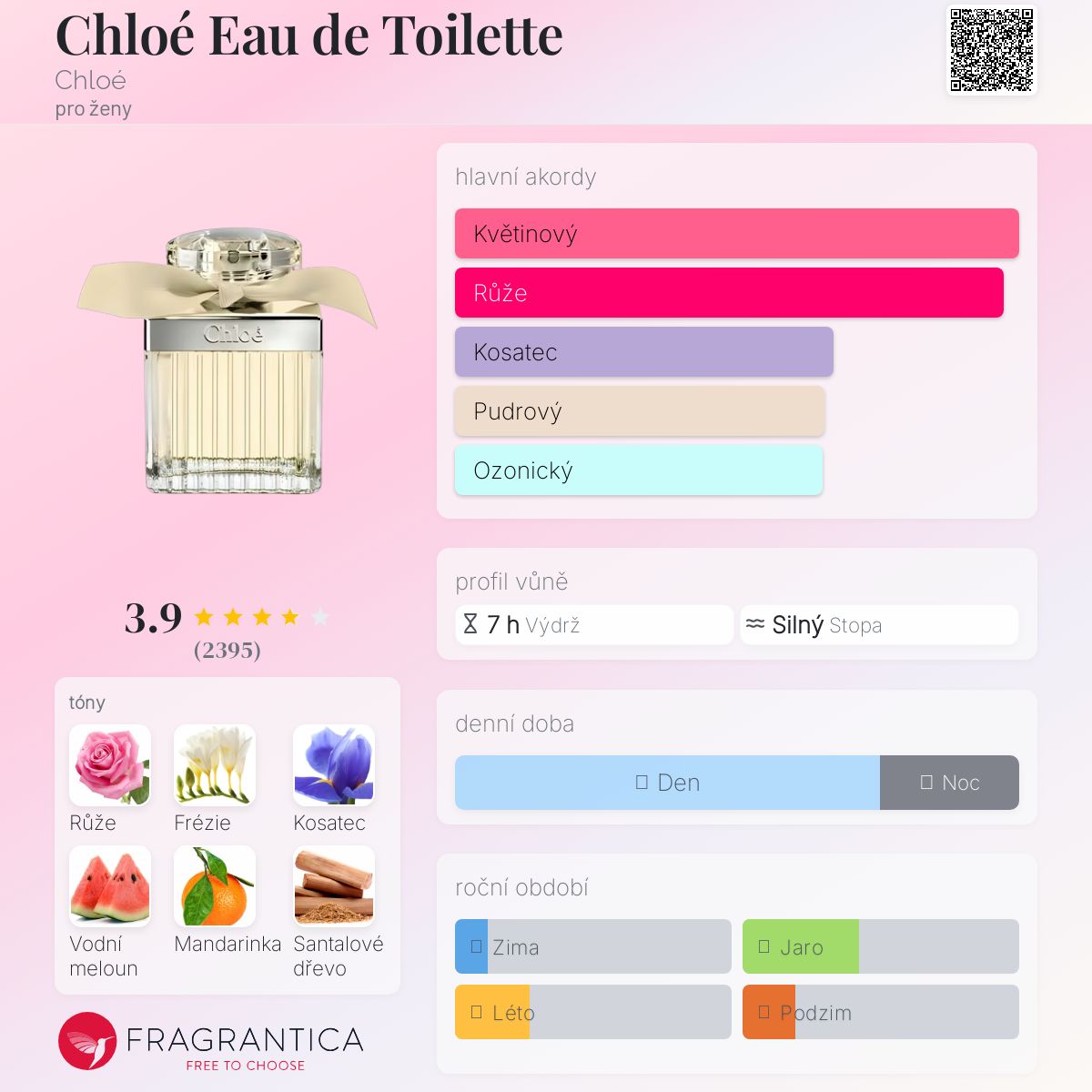 Chloé Eau de Toilette podle Chloé je Floral vůně pro ženy. Chloé Eau de Toilette byl/a uveden/a v roce 2009. Vrchní tóny jsou Vodní meloun, Mandarinka a Růžový pepř; střední tóny jsouTinktura z růže a Frézie ; základní tóny jsou Kosatec, Santalové dřevo a Fazole tonka.