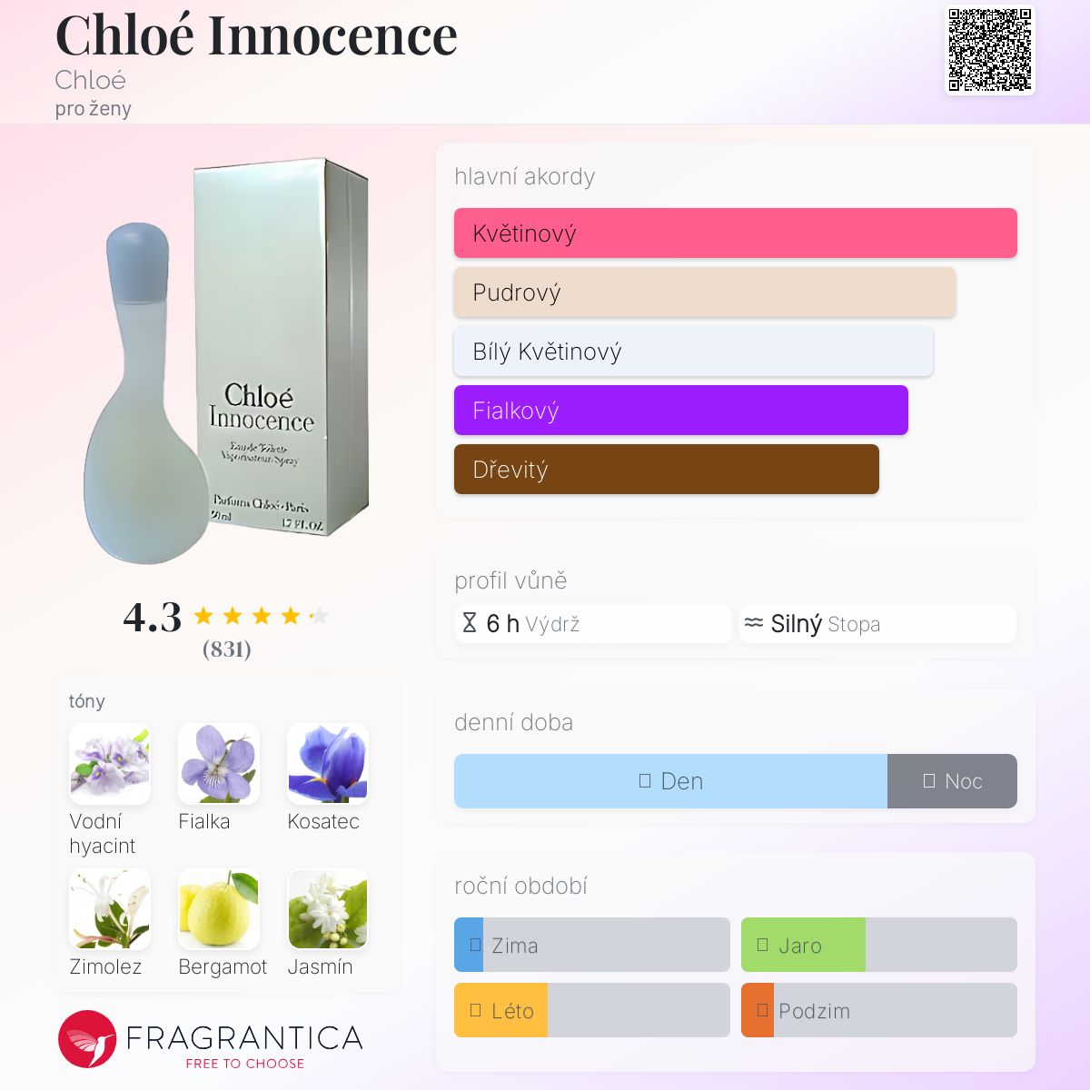 Chloé Innocence podle Chloé je Floral Green vůně pro ženy. Chloé Innocence byl/a uveden/a v roce 1995. "Nosem" za touto vůní je Nathalie Lorson. Vrchní tóny jsou Vodní hyacint a Bergamot; střední tóny jsouFialka, Zimolez, Jasmín a Růže ; základní tóny jsou Kosatec, Pižmo, Cedr a Vetiver.