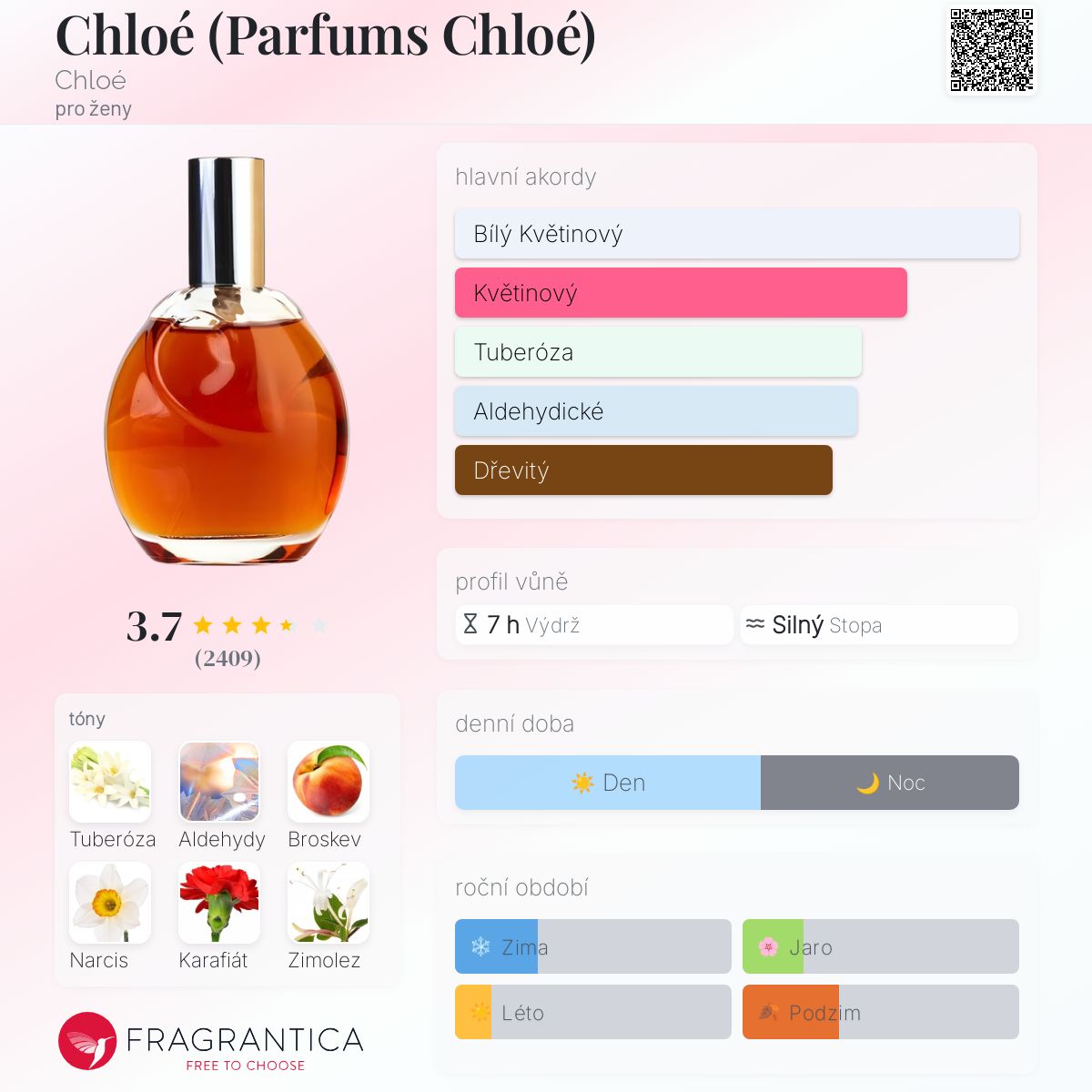 Chloé (Parfums Chloé) podle Chloé je Floral vůně pro ženy. Chloé (Parfums Chloé) byl/a uveden/a v roce 1975. "Nosem" za touto vůní je Betty Busse. Vrchní tóny jsou Aldehydy, Broskev, Zimolez, Hyacint, Šeřík, Ylang-Ylang, Pomerančový květ, Kokos a Bergamot; střední tóny jsouTuberóza, Narcis, Karafiát, Jasmín, Kořen orris a Růže ; základní tóny jsou Dubový mech, Jantar (ambra), Santalové dřevo, Benzoin, Pižmo a Cedr.