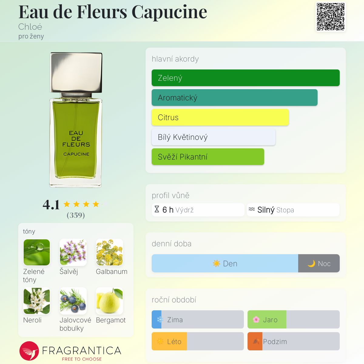 Eau de Fleurs Capucine podle Chloé je Floral Green vůně pro ženy. Eau de Fleurs Capucine byl/a uveden/a v roce 2010. "Nosem" za touto vůní je Louise Turner. Vrchní tóny jsou Zelené tóny, Šalvěj, Galbanum, Neroli, Jalovcové bobulky, Bergamot a Citron amalfi; střední tóny jsouKonvalinka, Jasmín a Tinktura z růže ; základní tóny jsou Pižmo a Ambretone.