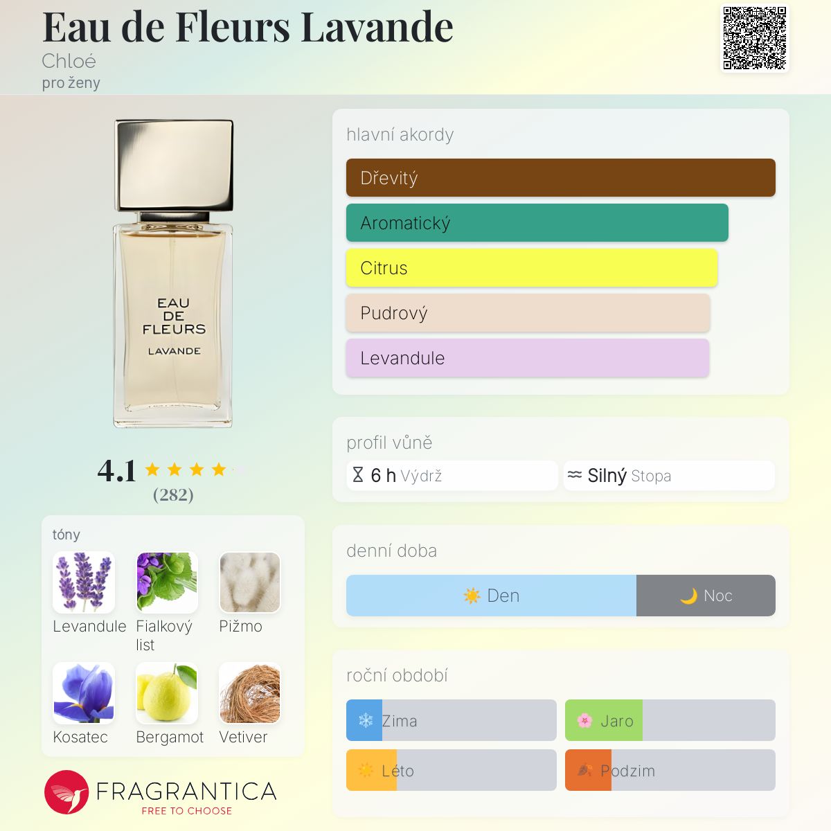 Eau de Fleurs Lavande podle Chloé je Aromatic vůně pro ženy. Eau de Fleurs Lavande byl/a uveden/a v roce 2010. "Nosem" za touto vůní je Domitille Michalon Bertier. Vrchní tóny jsou Fialkový list, Bergamot, Petitgrain a Citrusy; střední tóny jsouLevandule, Kosatec a Bergamot ; základní tóny jsou Pižmo, Vetiver, Cedr, Kašmír a Ambra.
