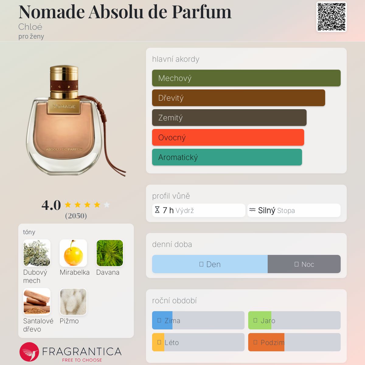 Nomade Absolu de Parfum podle Chloé je Chypre Fruity vůně pro ženy. Nomade Absolu de Parfum byl/a uveden/a v roce 2020. "Nosem" za touto vůní je Quentin Bisch. Vrchní tón je Mirabelka ; střední tóny jsouDubový mech a Davana ; základní tóny jsou Santalové dřevo a Pižmo.