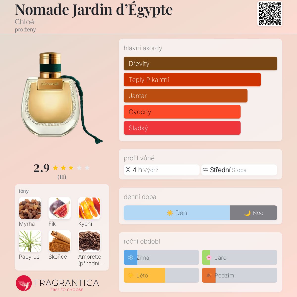 Nomade Jardin d’Égypte podle Chloé je Orientální Woody vůně pro ženy. Toto je nová vůně. Nomade Jardin d’Égypte byl/a uveden/a v roce 2025. "Nosem" za touto vůní je Caroline Dumur. Vrchní tón je Papyrus ; střední tóny jsouMyrha, Fík, Kyphi a Skořice ; základní tóny jsou Ambrette (přírodní pižmo) a Santalové dřevo.