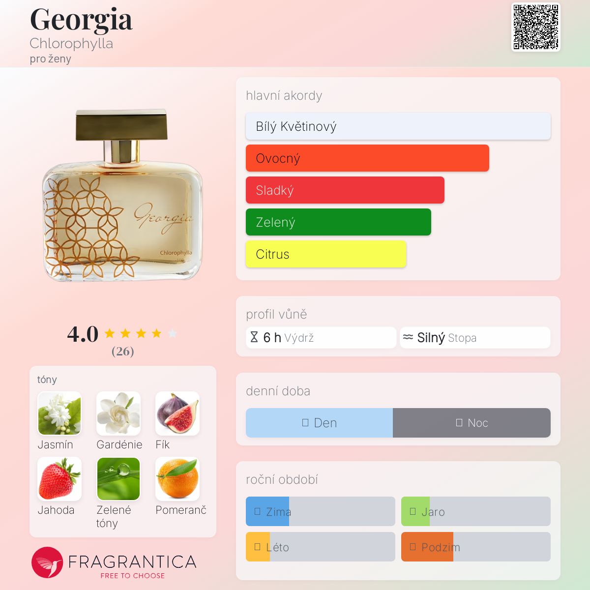 Georgia podle Chlorophylla je Floral Green vůně pro ženy. Georgia byl/a uveden/a v roce 1992. Vrchní tóny jsou Jahoda, Zelené tóny, Pomeranč a Jablko; střední tóny jsouJasmín, Gardénie, Fík a Růže ; základní tón je Pižmo.