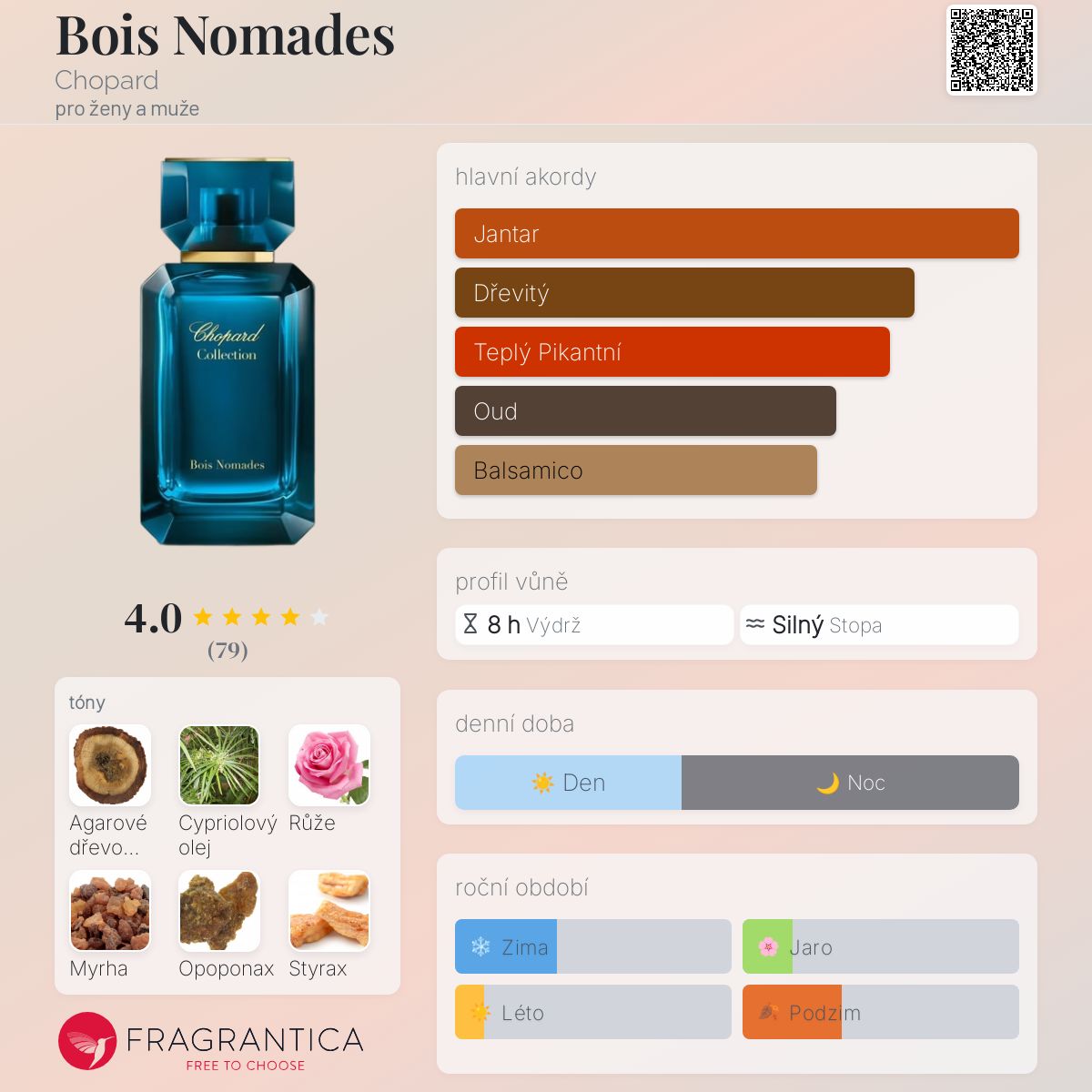 Bois Nomades podle Chopard je Orientální Woody vůně pro ženy a muže. Bois Nomades byl/a uveden/a v roce 2022. "Nosem" za touto vůní je Alberto Morillas. Vrchní tóny jsou Skořice, Tabák, Hřebíček a Černý pepř; střední tón jeDamašská růže ; základní tóny jsou Agarové dřevo (oud), Myrha, Cypriolový olej, Opoponax, Styrax, Atlasový cedr a Olibanum.