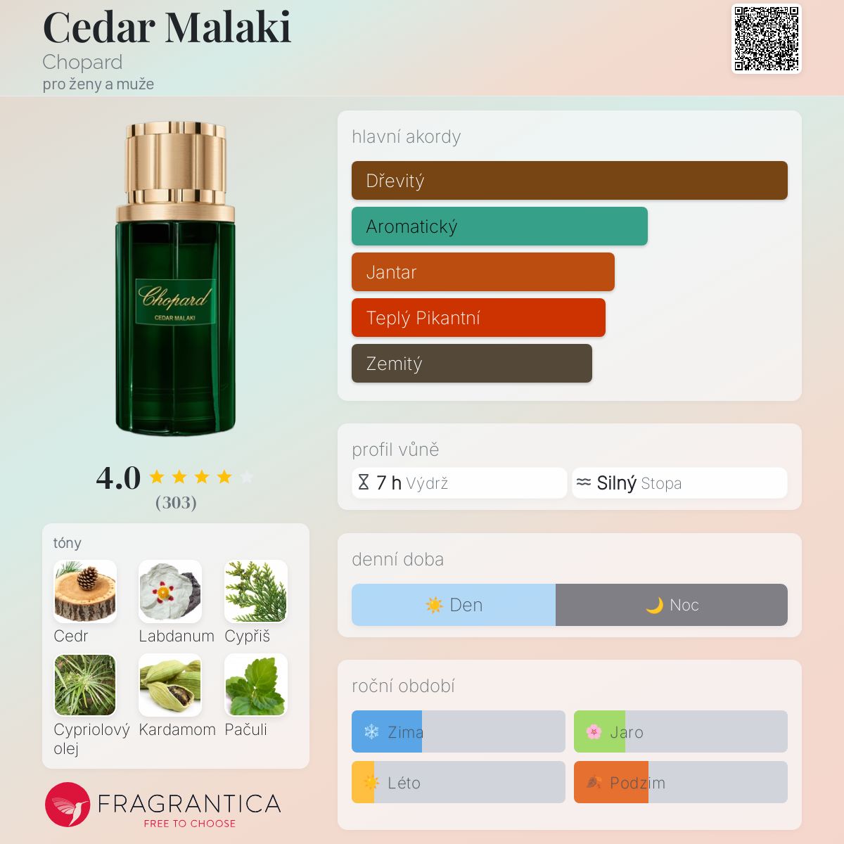 Cedar Malaki podle Chopard je vůně pro ženy a muže. Cedar Malaki byl/a uveden/a v roce 2023. "Nosem" za touto vůní je Alberto Morillas. Vrchní tóny jsou Cypřiš, Kardamom, Pelyněk, Grapefruit a Levandule; střední tóny jsouAtlasový cedr a Cedr ; základní tóny jsou Labdanum, Cypriolový olej, Pačuli a Fazole tonka.