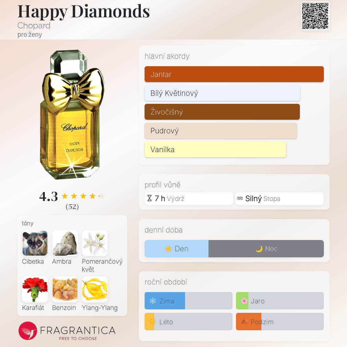 Happy Diamonds podle Chopard je Orientální Floral vůně pro ženy. Happy Diamonds byl/a uveden/a v roce 1986. Vrchní tóny jsou Pomerančový květ, Galbanum, Citrón, Bergamot a Ovocné tóny; střední tóny jsouKarafiát, Ylang-Ylang, Otočník, Kosatec, Tuberóza, Jasmín, Santalové dřevo a Růže ; základní tóny jsou Cibetka, Ambra, Benzoin, Fazole tonka, Vetiver, Vanilka a Cedr.