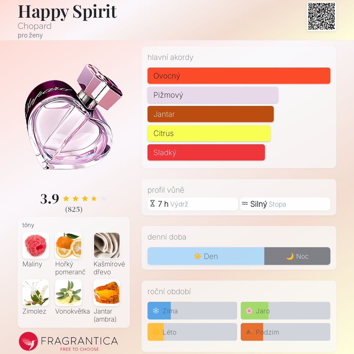 Happy Spirit podle Chopard je Floral vůně pro ženy. Happy Spirit byl/a uveden/a v roce 2007. "Nosem" za touto vůní je Dominique Ropion. Vrchní tóny jsou Maliny a Hořký pomeranč; střední tóny jsouZimolez a Vonokvětka ; základní tóny jsou Kašmírové dřevo, Jantar (ambra) a Pižmo.
