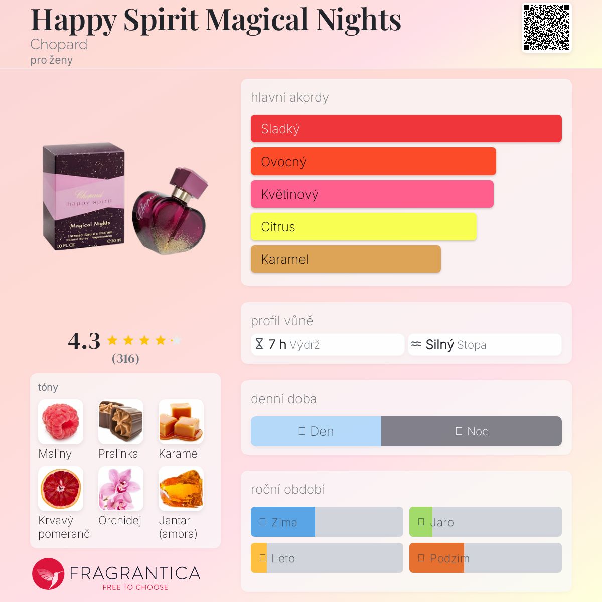 Happy Spirit Magical Nights podle Chopard je Orientální Vanilla vůně pro ženy. Happy Spirit Magical Nights byl/a uveden/a v roce 2008. Vrchní tóny jsou Krvavý pomeranč, Magnólie a Yuzu; střední tóny jsouMaliny, Orchidej a Vonokvětka ; základní tóny jsou Pralinka, Karamel a Jantar (ambra).