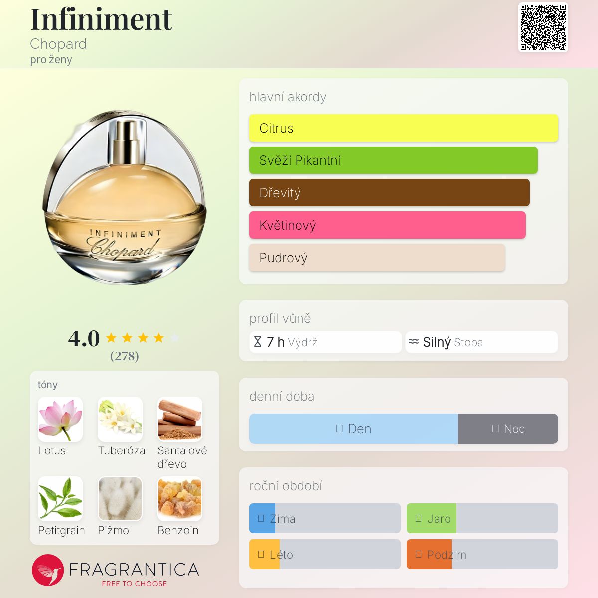 Infiniment podle Chopard je Floral Woody Musk vůně pro ženy. Infiniment byl/a uveden/a v roce 2004. "Nosem" za touto vůní je Alberto Morillas. Vrchní tóny jsou Petitgrain, Bergamot a Sečuánský pepř; střední tóny jsouLotus, Tuberóza a Bulharská růže ; základní tóny jsou Santalové dřevo, Pižmo a Benzoin.