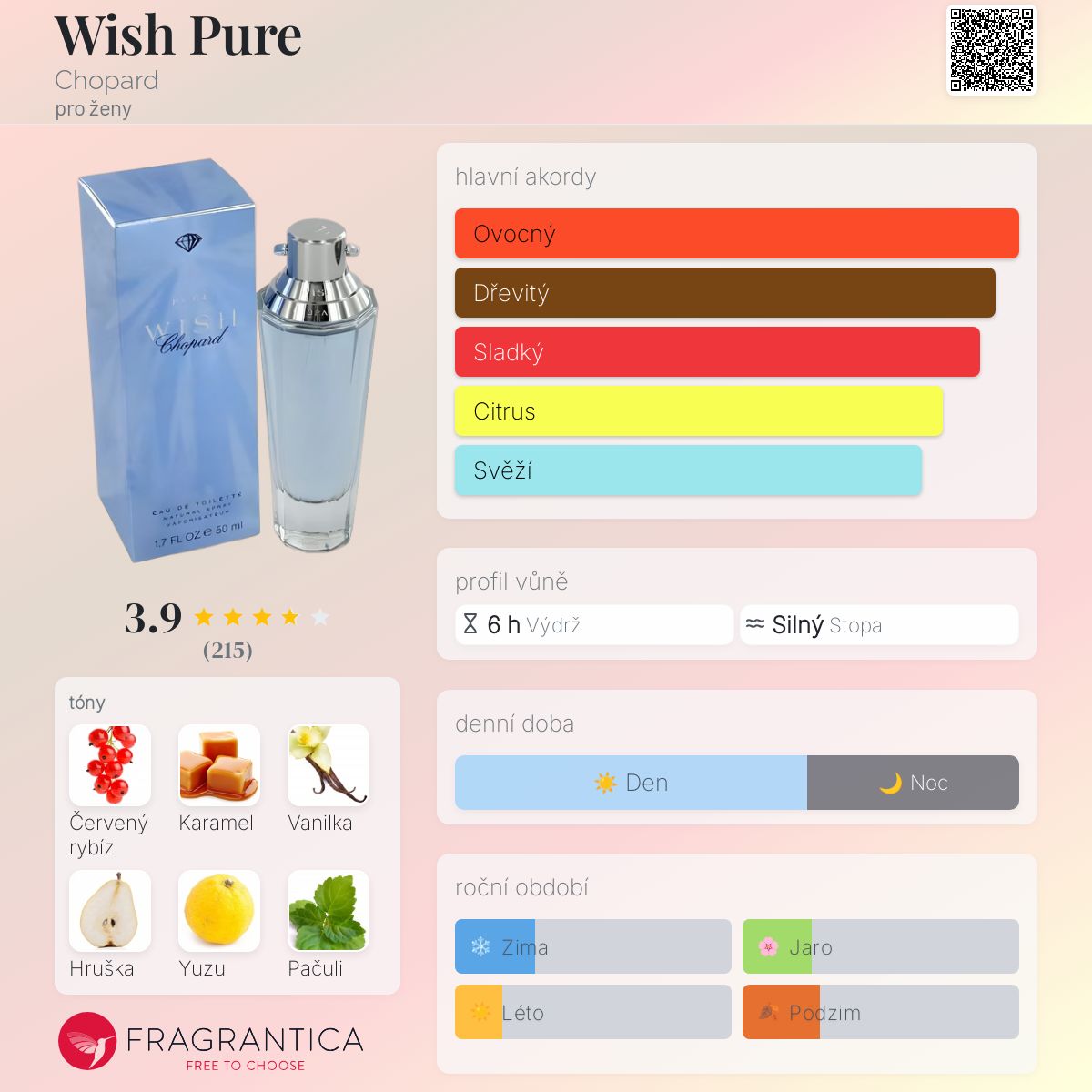 Wish Pure podle Chopard je Orientální Vanilla vůně pro ženy. Wish Pure byl/a uveden/a v roce 2000. "Nosem" za touto vůní je Nathalie Lorson. Vrchní tóny jsou Červený rybíz, Hruška, Yuzu a Mandarinka; střední tóny jsouPačuli, Brambořík, Jamajský pepř a Konvalinka ; základní tóny jsou Karamel, Vanilka, Santalové dřevo a Cedr.