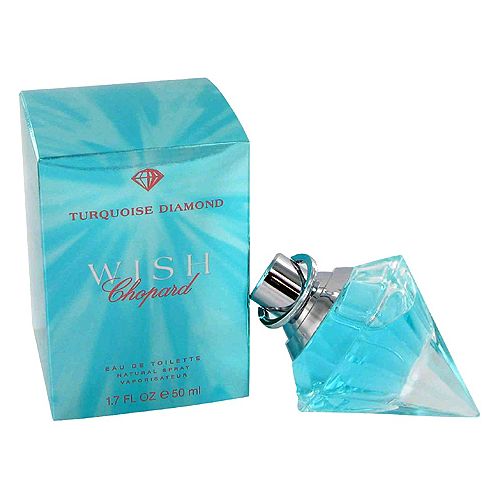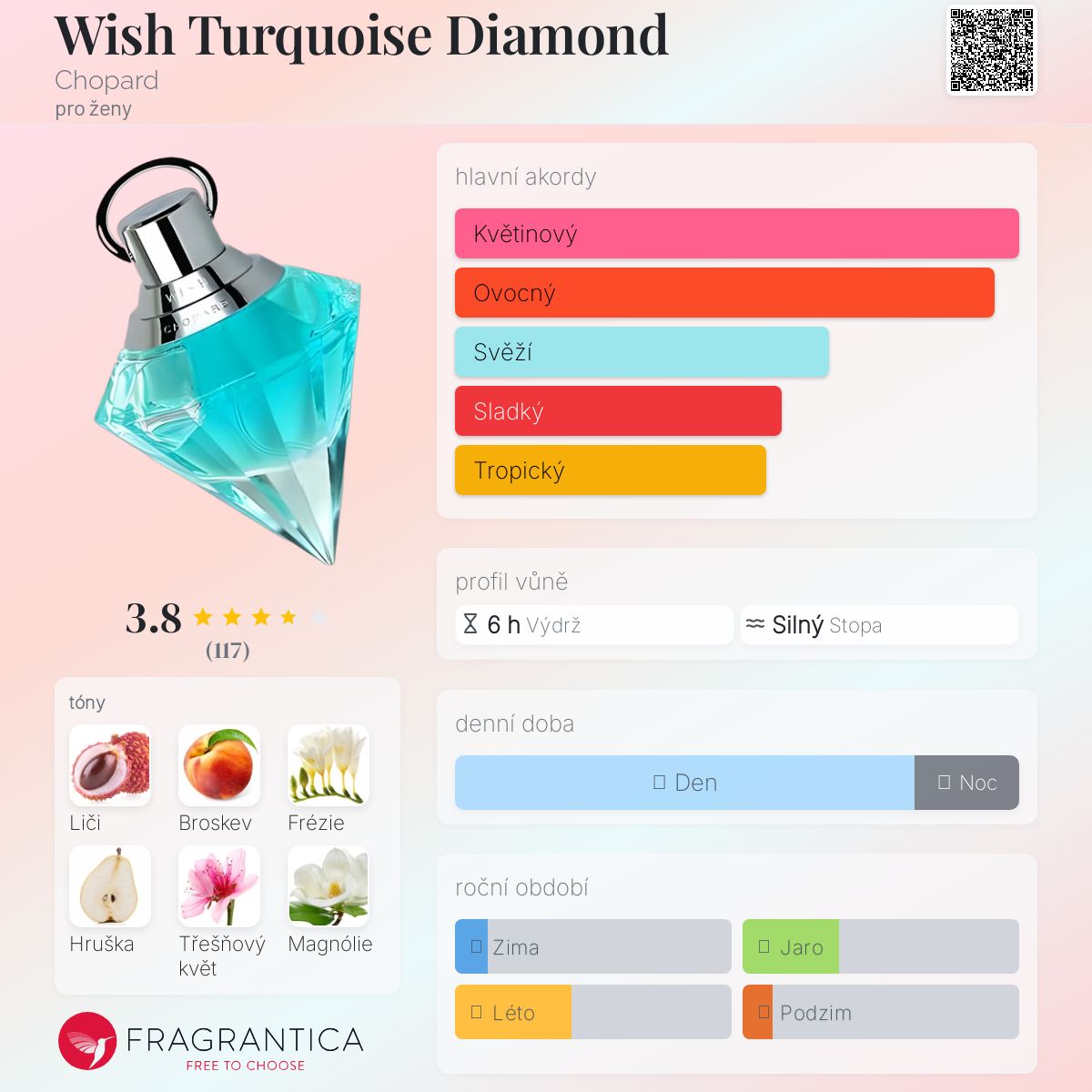 Wish Turquoise Diamond podle Chopard je Floral vůně pro ženy. Wish Turquoise Diamond byl/a uveden/a v roce 2007. "Nosem" za touto vůní je Ursula Wandel. Vrchní tóny jsou Liči, Broskev, Frézie a Hruška; střední tóny jsouTřešňový květ a Magnólie ; základní tóny jsou Bílé pižmo, Santalové dřevo a Jantar (ambra).