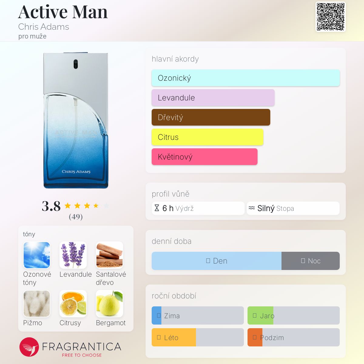 Active Man podle Chris Adams je Aromatic Fougere vůně pro muže. Vrchní tóny jsou Ozonové tóny, Citrusy a Bergamot; střední tóny jsouLevandule, Květinové tóny, Růže a Jasmín ; základní tóny jsou Santalové dřevo, Pižmo a Cedr.