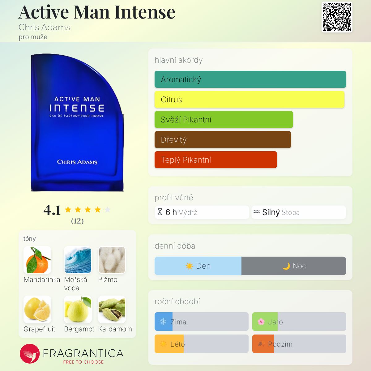 Active Man Intense podle Chris Adams je Woody Aromatic vůně pro muže. Vrchní tóny jsou Mandarinka, Vodní tóny, Grapefruit, Bergamot, Fialkové listy, Levandule, Neroli, Citrón a Jablko; střední tóny jsouKardamom, Koriandr, Pelargónie, Cypřiš, Kadidlo, Pepř, Meloun a Šalvěj ; základní tóny jsou Pižmo, Dubový mech, Guajakové dřevo, Santalové dřevo, Vetiver a Jantar (ambra).