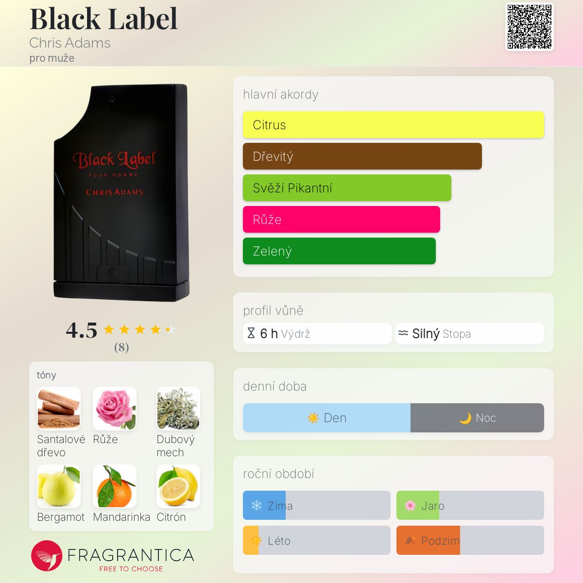 Black Label podle Chris Adams je Citrus vůně pro muže. Vrchní tóny jsou Bergamot, Mandarinka, Citrón, Pepř a Zelené tóny; střední tóny jsouRůže a Konvalinka ; základní tóny jsou Santalové dřevo, Dubový mech a Jantar (ambra).