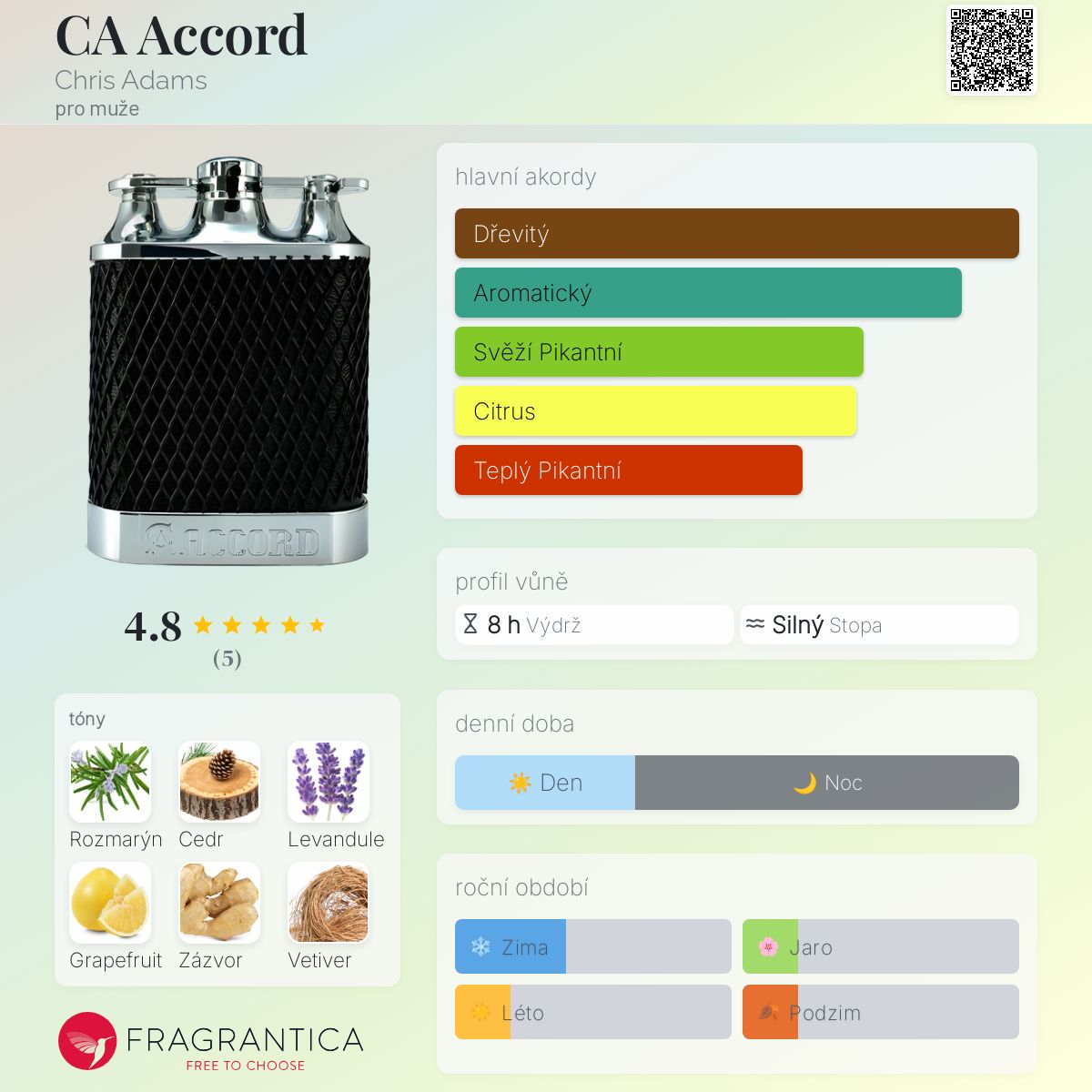 CA Accord podle Chris Adams je Citrus Aromatic vůně pro muže. Vrchní tóny jsou Rozmarýn, Grapefruit a Bergamot; střední tóny jsouLevandule a Zázvor ; základní tóny jsou Cedr, Vetiver a Santalové dřevo.