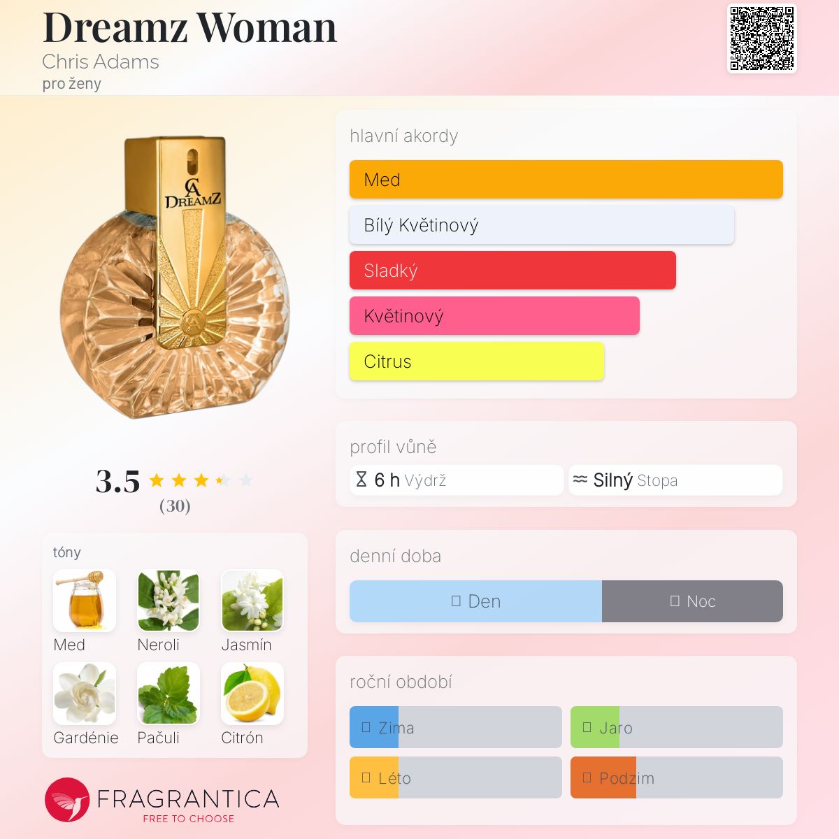 Dreamz Woman podle Chris Adams je vůně pro ženy. Vrchní tóny jsou Neroli, Citrón a Maliny; střední tóny jsouJasmín a Gardénie ; základní tóny jsou Med a Pačuli.