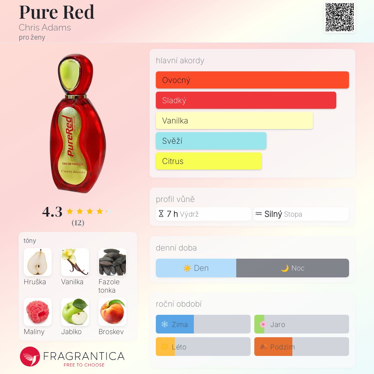 Pure Red podle Chris Adams je Floral Fruity vůně pro ženy. Vrchní tóny jsou Hruška, Maliny, Jablko, Bílá broskev, Citrón, Banán, Ananas, Bergamot a Černý pepř; střední tóny jsouPomerančový květ, Jasmín, Leknín a Růže ; základní tóny jsou Vanilka, Fazole tonka, Pačuli a Bílé pižmo.