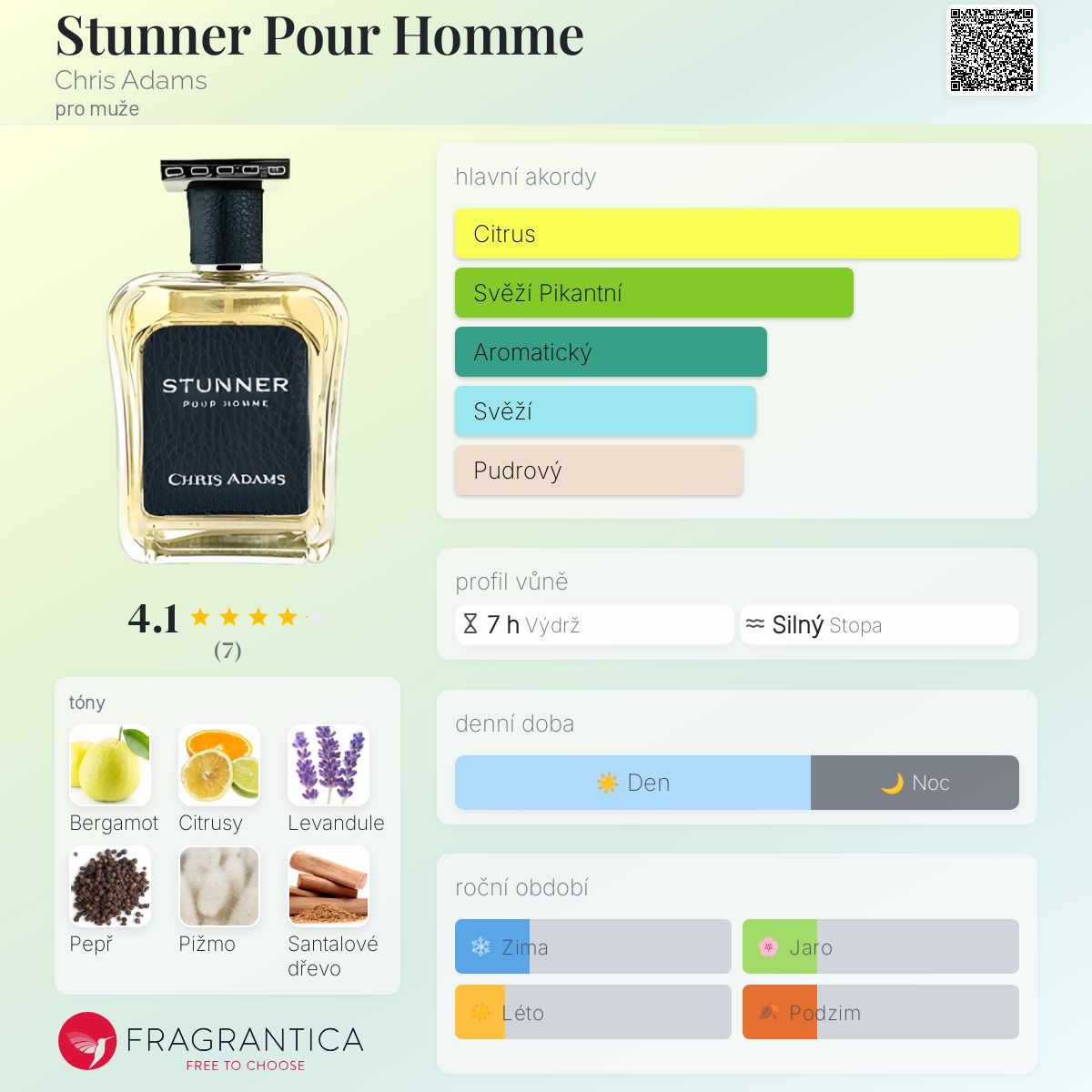 Stunner Pour Homme podle Chris Adams je Orientální Fougere vůně pro muže. Vrchní tóny jsou Bergamot a Citrusy; střední tóny jsouLevandule a Pepř ; základní tóny jsou Pižmo, Santalové dřevo a Jantar (ambra).