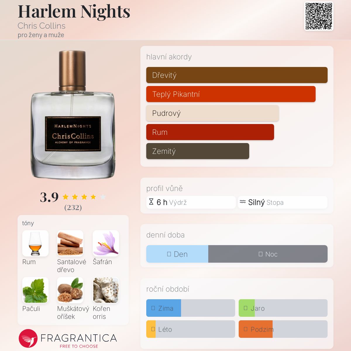 Harlem Nights podle Chris Collins je vůně pro ženy a muže. Harlem Nights byl/a uveden/a v roce 2017. "Nosem" za touto vůní je Laurent Marrone. Vrchní tóny jsou Rum, Šafrán, Muškátový oříšek, Hřebíček, Grapefruit a Citrón; střední tóny jsouPačuli, Kořen orris, Cedr a Jasmín ; základní tóny jsou Santalové dřevo, Vanilka, Pižmo a Vetiver.