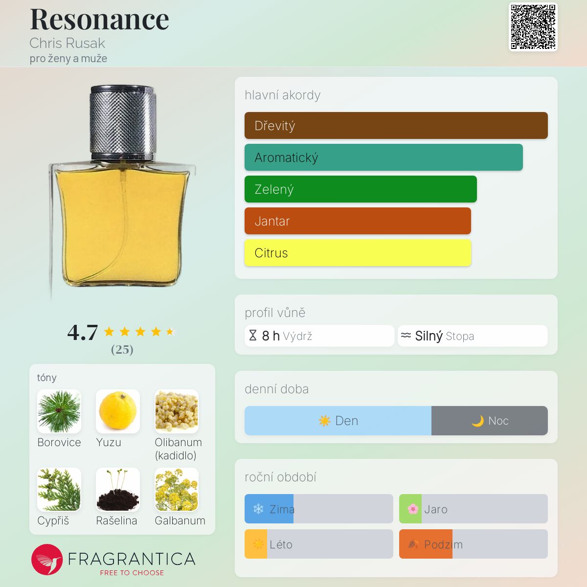 Resonance podle Chris Rusak je Orientální Woody vůně pro ženy a muže. Resonance byl/a uveden/a v roce 2021. "Nosem" za touto vůní je Chris Rusak.