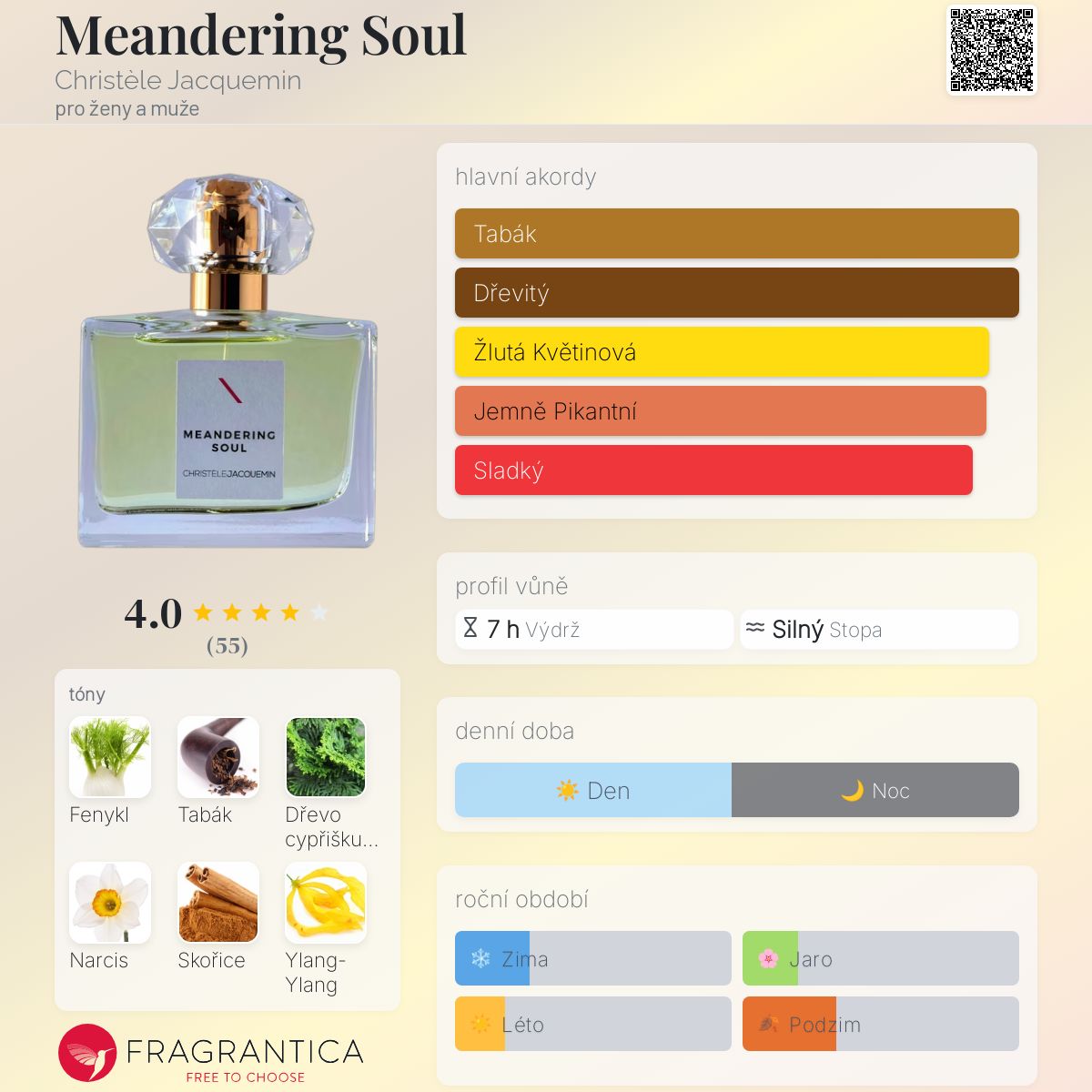 Meandering Soul podle Christèle Jacquemin je Orientální Floral vůně pro ženy a muže. Meandering Soul byl/a uveden/a v roce 2019. "Nosem" za touto vůní je Christèle Jacquemin. Vrchní tóny jsou Fenykl a Dřevo cypřišku tupolistého; střední tóny jsouNarcis, Skořice a Ylang-Ylang ; základní tóny jsou Tabák a Karamel.