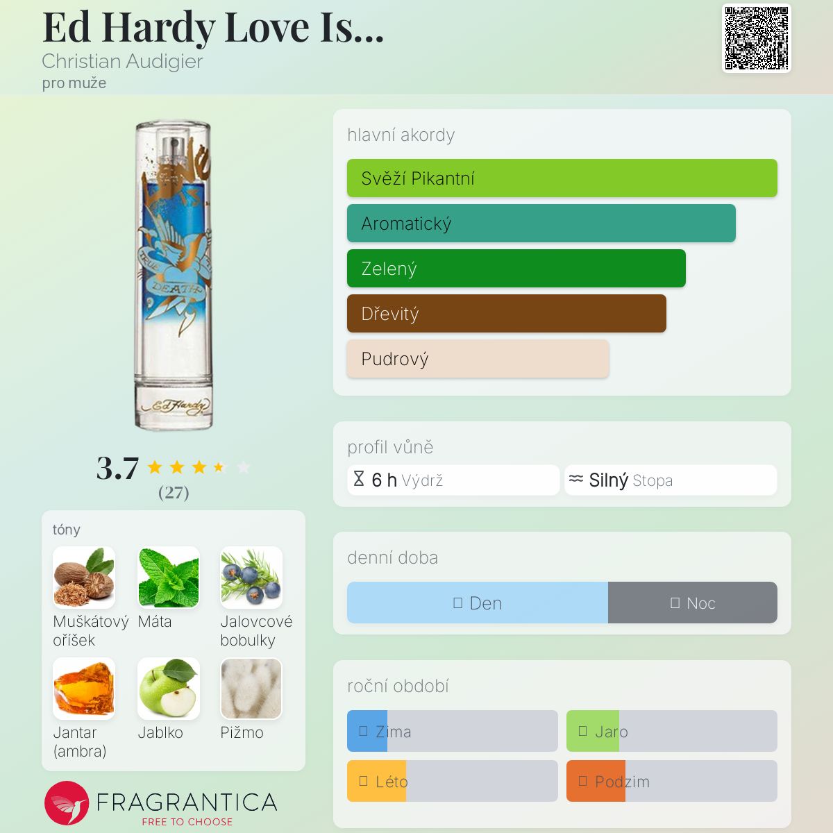Ed Hardy Love Is... podle Christian Audigier je Orientální Woody vůně pro muže. Ed Hardy Love Is... byl/a uveden/a v roce 2014. Vrchní tóny jsou Muškátový oříšek, Máta a Jablko; střední tóny jsouJalovcové bobulky a Šafrán ; základní tóny jsou Jantar (ambra), Pižmo, Santalové dřevo a Vetiver.