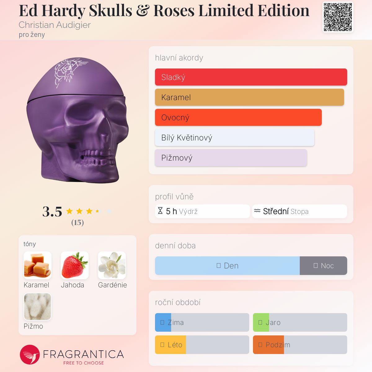 Ed Hardy Skulls & Roses Limited Edition podle Christian Audigier je Floral Fruity Gourmand vůně pro ženy. Ed Hardy Skulls & Roses Limited Edition byl/a uveden/a v roce 2013. Vrchní tón je Velká jahoda ; střední tóny jsouKaramel a Gardénie ; základní tón je Pižmo.