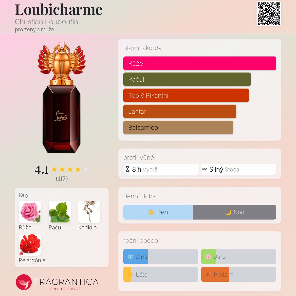 Loubicharme podle Christian Louboutin je Chypre vůně pro ženy a muže. Loubicharme byl/a uveden/a v roce 2021. "Nosem" za touto vůní je Christophe Raynaud. Vrchní tón je Kadidlo ; střední tóny jsouRůže a Pelargónie ; základní tón je Pačuli.