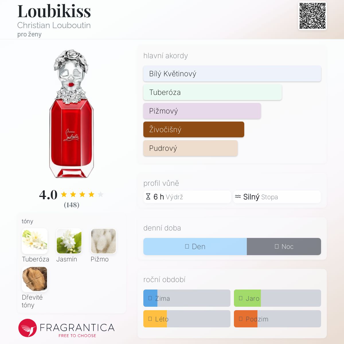 Loubikiss podle Christian Louboutin je Floral Woody Musk vůně pro ženy. Loubikiss byl/a uveden/a v roce 2020. "Nosem" za touto vůní je Daphné Bugey. Vrchní tón je Jasmín ; střední tón jeTuberóza ; základní tóny jsou Pižmo a Dřevité tóny.