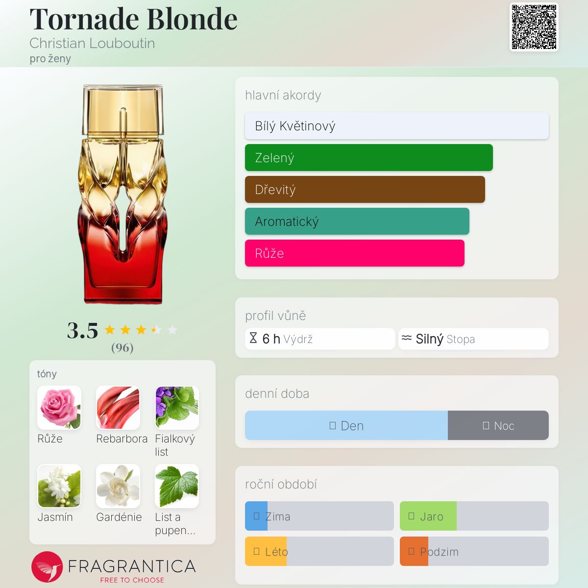 Tornade Blonde podle Christian Louboutin je Chypre Floral vůně pro ženy. Tornade Blonde byl/a uveden/a v roce 2016. "Nosem" za touto vůní je Olivier Cresp. Vrchní tóny jsou Rebarbora, Fialkový list, Černý rybíz a Ambrette (přírodní pižmo); střední tóny jsouBulharská růže, Jasmín Sambac, Gardénie a Pomerančový květ ; základní tóny jsou Ambra, Cedr, Santalové dřevo a Pačuli.