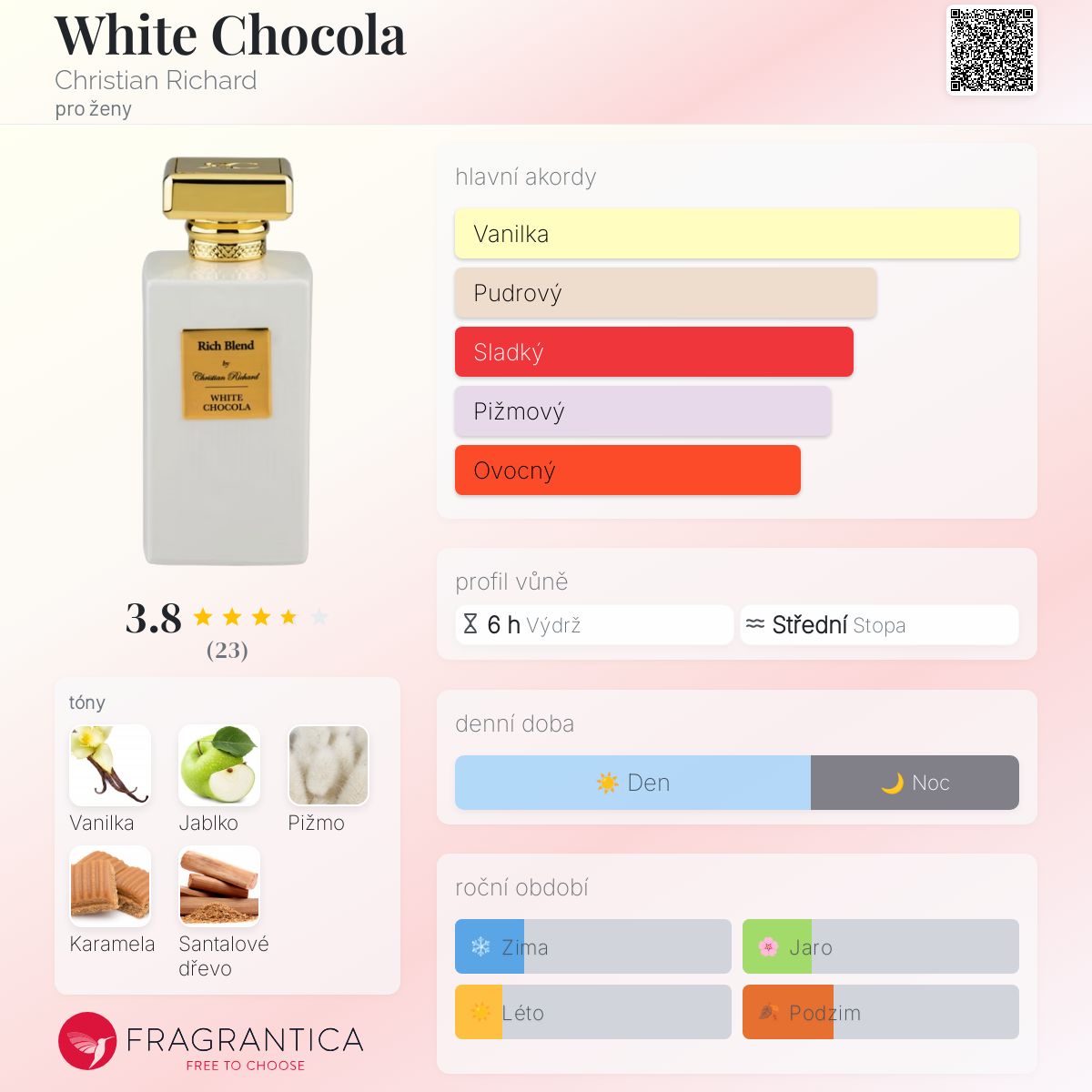 White Chocola podle Christian Richard je vůně pro ženy. White Chocola byl/a uveden/a v roce 2016. Vrchní tóny jsou Karamela a Jablko; střední tón jeVanilkový květ ; základní tóny jsou Vanilka, Bílé pižmo a Santalové dřevo.