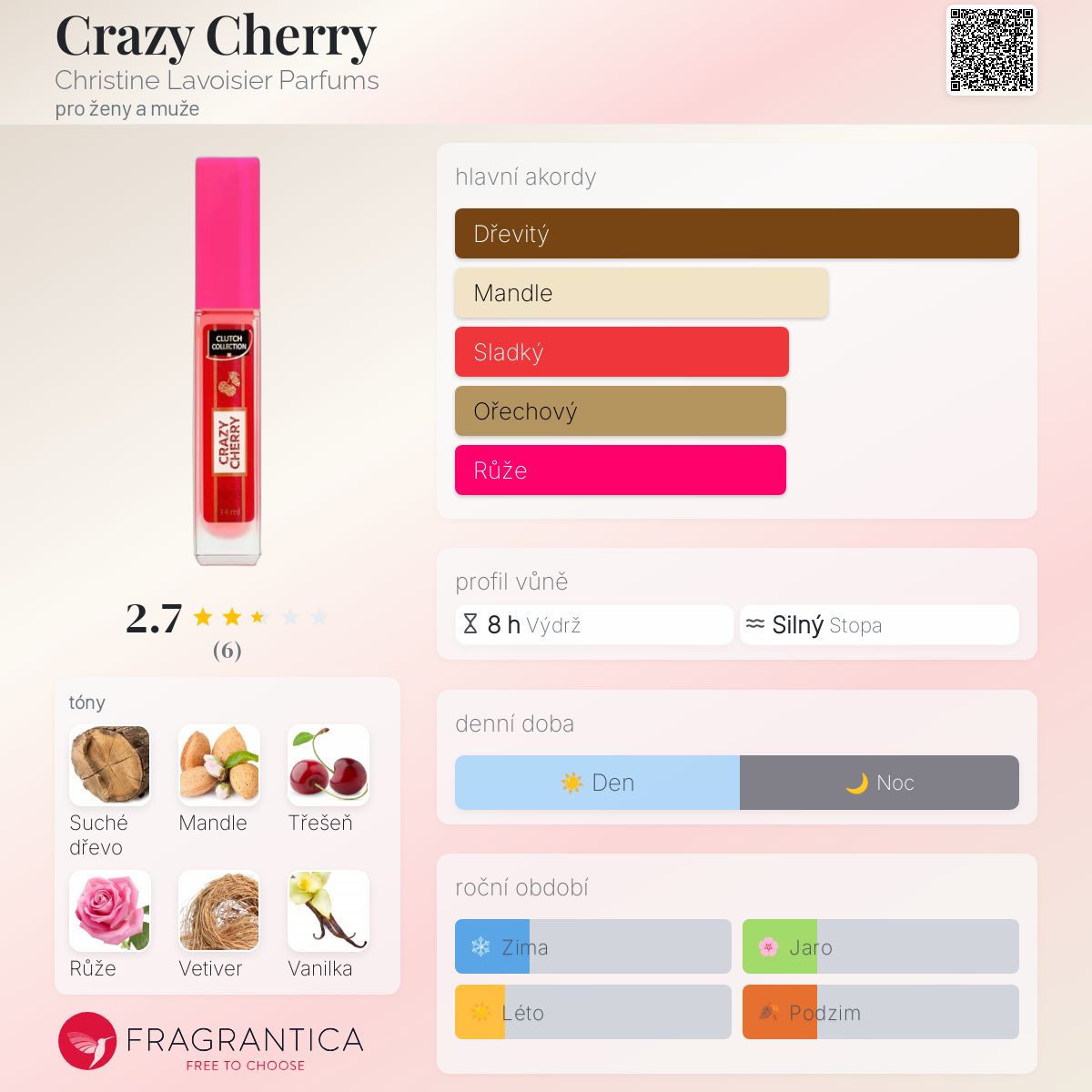 Crazy Cherry podle Christine Lavoisier Parfums je Orientální Floral vůně pro ženy a muže. Crazy Cherry byla spuštěna během 2020. Vrchní tóny jsou Mandle a Zelené tóny; střední tóny jsouSuché dřevo, Třešeň, Růže, Vetiver, Santalové dřevo, Pačuli a Pomerančový květ ; základní tón je Vanilka.
