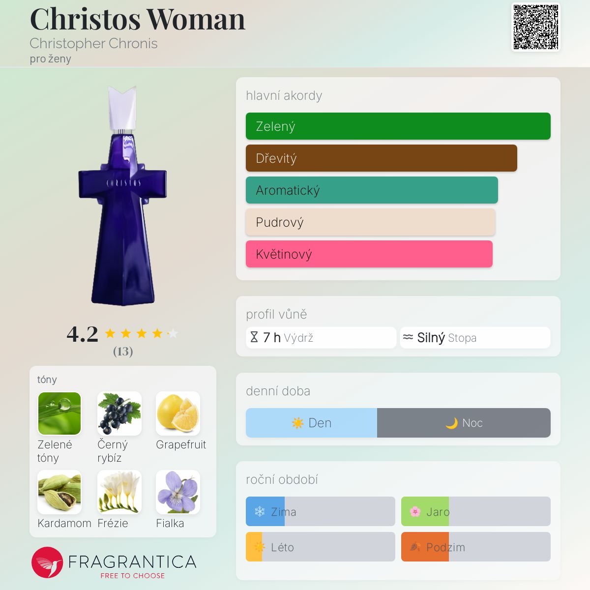 Christos Woman podle Christopher Chronis je Orientální Woody vůně pro ženy. Christos Woman byl/a uveden/a v roce 1998. Christos Woman byl/a vytvořen/a Christopher Chronis a Dragoco. Vrchní tóny jsou Zelené listí, Černý rybíz, Grapefruit a Kardamom; střední tóny jsouFrézie, Fialka, Růže, Pelargónie, Jasmín, Pomerančový květ a Ozonové tóny ; základní tóny jsou Jantar (ambra), Cedr, Santalové dřevo, Fazole tonka, Pižmo a Vanilka.