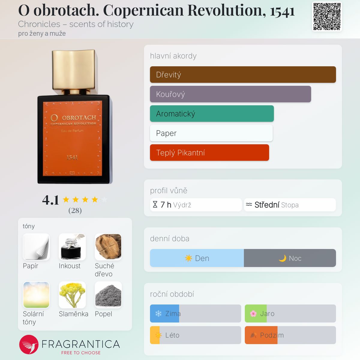 O obrotach. Copernican Revolution, 1541 podle Chronicles – scents of history je Woody vůně pro ženy a muže. Toto je nová vůně. O obrotach. Copernican Revolution, 1541 byl/a uveden/a v roce 2025. "Nosem" za touto vůní je Alan Balewski. Vrchní tóny jsou Solární tóny a Konvalinka; střední tóny jsouInkoust, Slaměnka a Kadidlo ; základní tóny jsou Papír, Suché dřevo, Popel a Kůže.