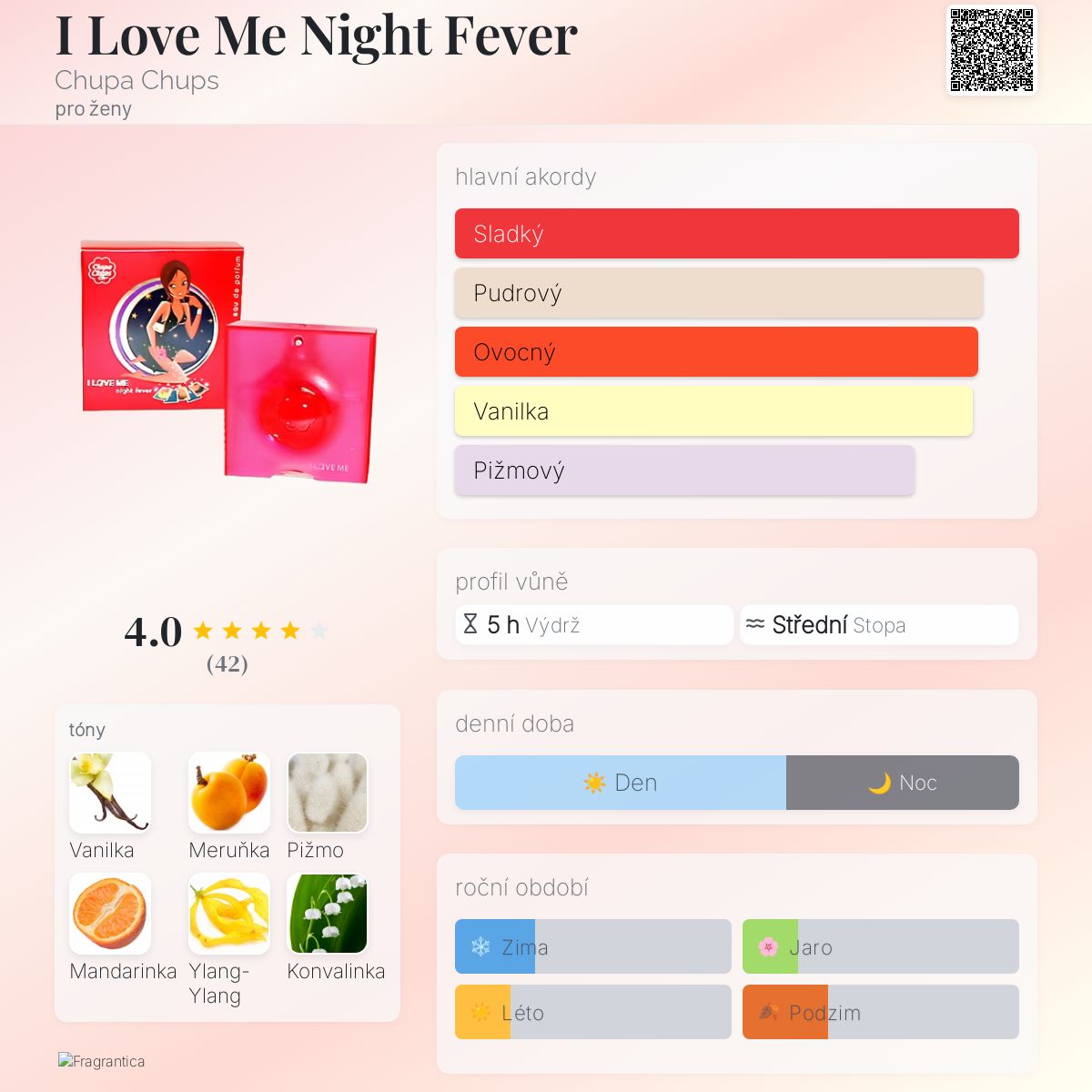 I Love Me Night Fever podle Chupa Chups je Floral Fruity vůně pro ženy. I Love Me Night Fever byl/a uveden/a v roce 2003. "Nosem" za touto vůní je Daniel Moliere. Vrchní tóny jsou Meruňka, Mandarinka a Hruška; střední tóny jsouYlang-Ylang, Konvalinka a Frézie ; základní tóny jsou Vanilka, Pižmo a Virginský cedr.