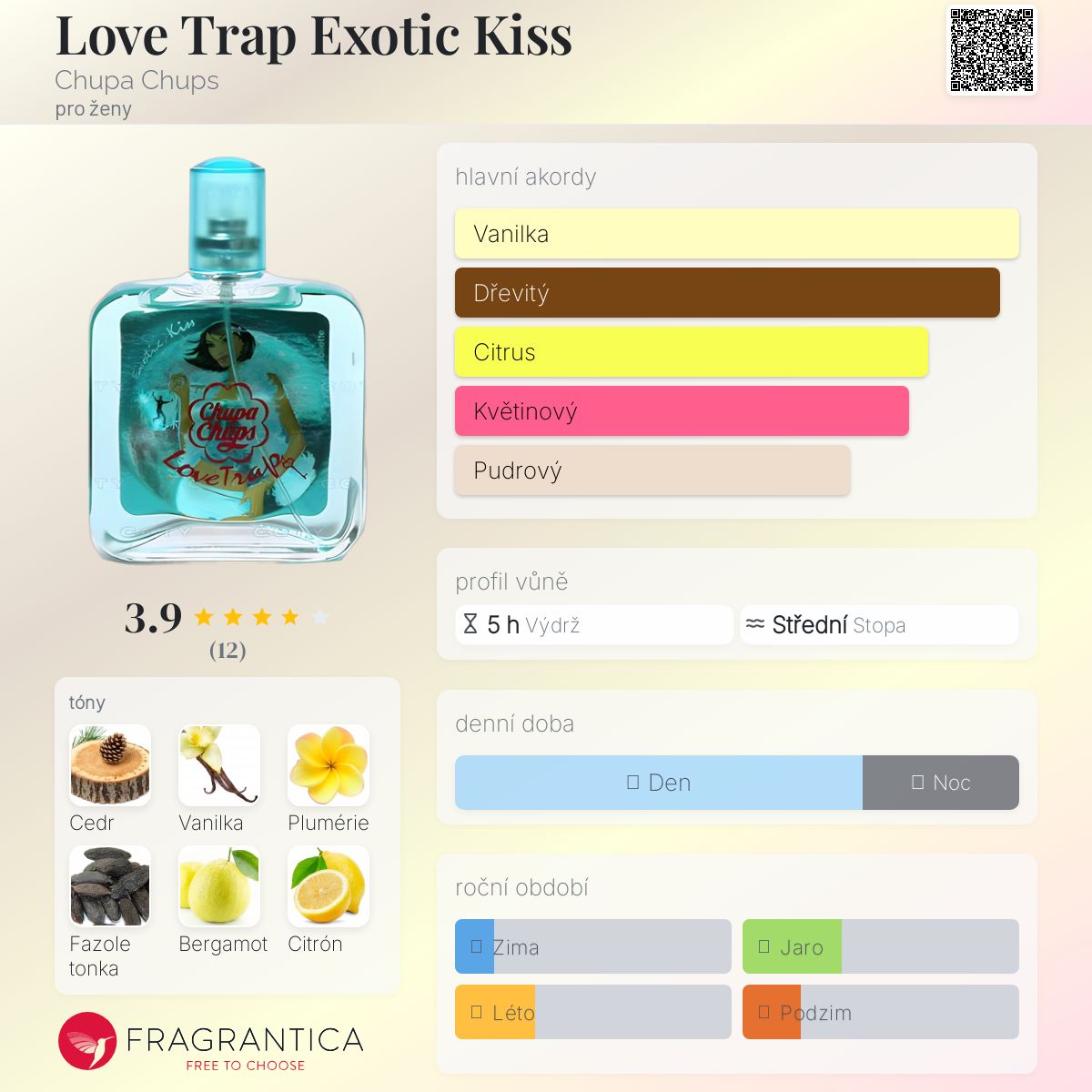 Love Trap Exotic Kiss podle Chupa Chups je Floral Fruity vůně pro ženy. Love Trap Exotic Kiss byl/a uveden/a v roce 2005. Vrchní tóny jsou Bergamot, Citron amalfi a Mandarinka; střední tóny jsouPlumérie, Růže a Švestka ; základní tóny jsou Virginský cedr, Vanilka, Fazole tonka, Santalové dřevo a Muškátový oříšek.