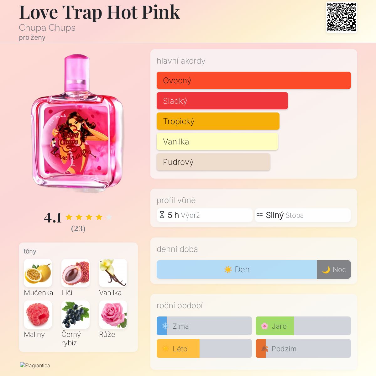 Love Trap Hot Pink podle Chupa Chups je Floral Fruity vůně pro ženy. Love Trap Hot Pink byl/a uveden/a v roce 2005. Vrchní tóny jsou Mučenka, Liči, Černý rybíz, Mandarinka, Pepř a Hruška; střední tóny jsouRůže, Gardénie, Švestka, Nektarinka a Pomeranč ; základní tóny jsou Vanilka, Maliny, Santalové dřevo, Jantar (ambra), Otočník a Meruňka.
