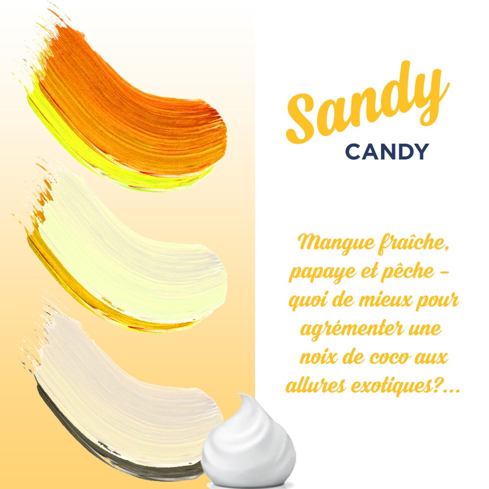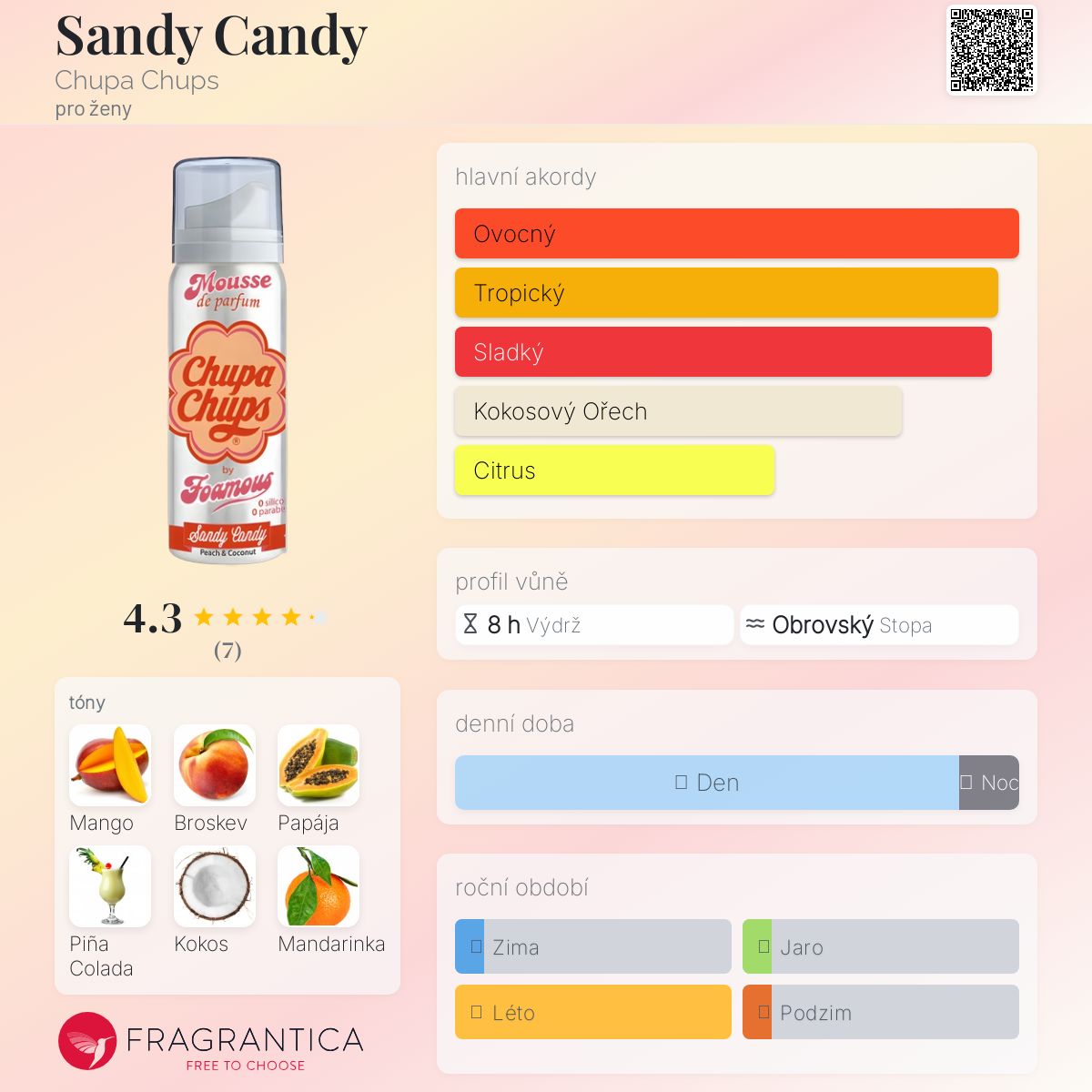 Sandy Candy podle Chupa Chups je Floral Fruity vůně pro ženy. Sandy Candy byl/a uveden/a v roce 2019. Vrchní tóny jsou Mango, Papája a Mandarinka; střední tóny jsouBroskev a Piña Colada ; základní tóny jsou Kokos, Pižmo a Santalové dřevo.