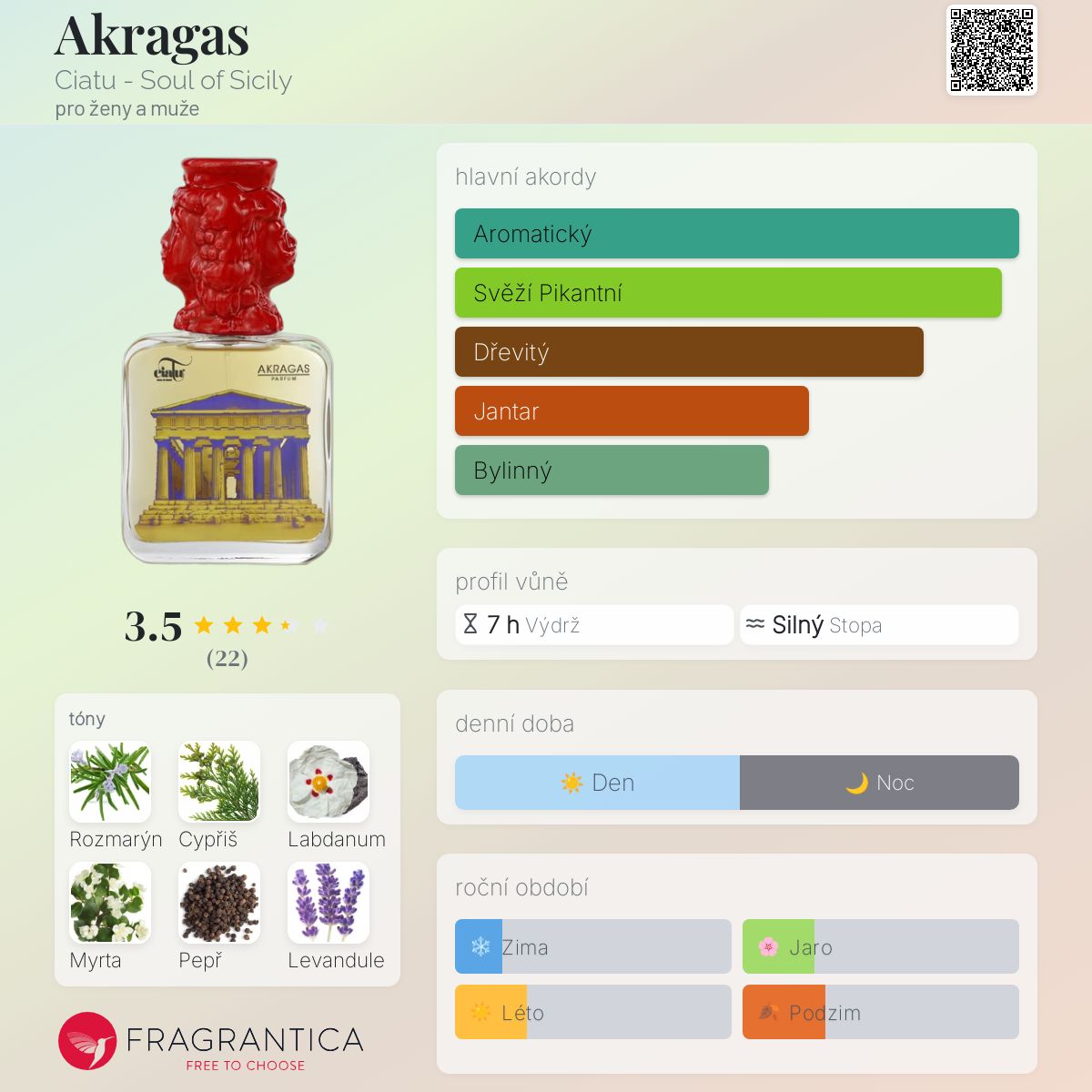 Akragas podle Ciatu - Soul of Sicily je vůně pro ženy a muže. Akragas byl/a uveden/a v roce 2022. Vrchní tóny jsou Myrta, Levandule, Rum, Kadidlo a Bergamot; střední tóny jsouRozmarýn, Cypřiš, Černý pepř, Badyán a Mandarinka ; základní tóny jsou Labdanum, Pačuli, Jantar (ambra), Santalové dřevo a Pižmo.